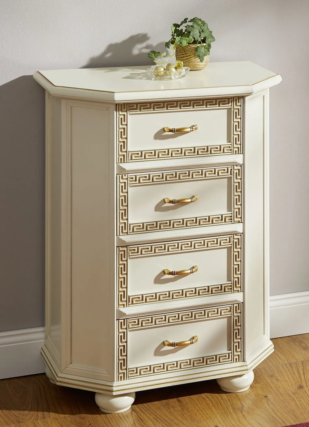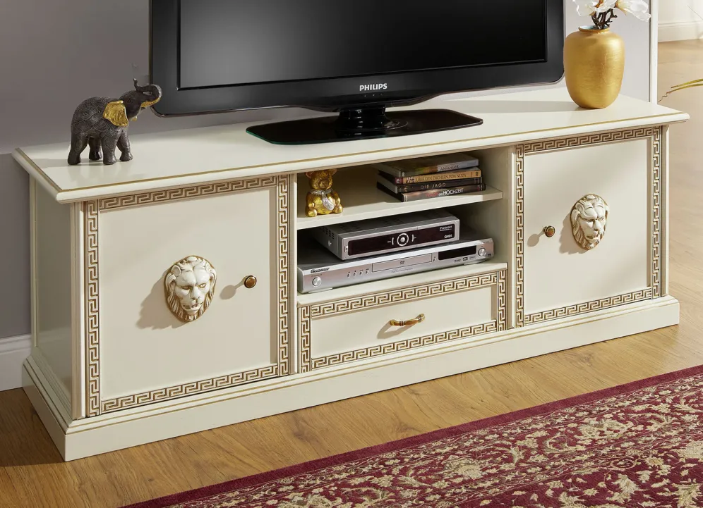 Einen fantastischen Akzent in Ihrem Wohnraum setzen Sie mit diesem hochwertigen Möbelprogramm! Mit zahlreichen Verzierungen an den Schubladen und Türen mit gewollt eingearbeiteten Gebrauchsspuren. Mit schönen Metallgriffen an den Schubladen und Metallknöpfen an den Türen. Die Lieferung erfolgt aufgebaut
