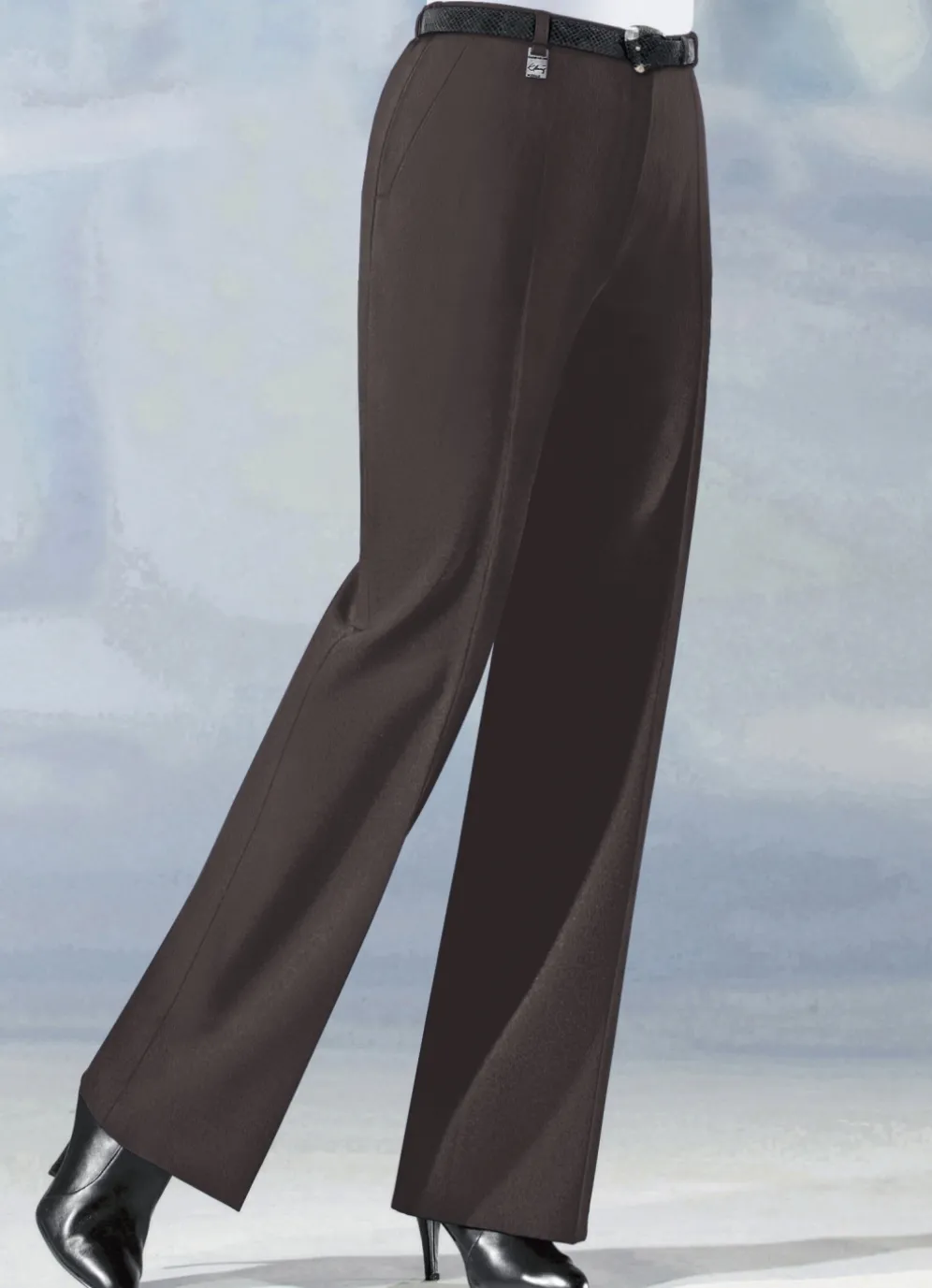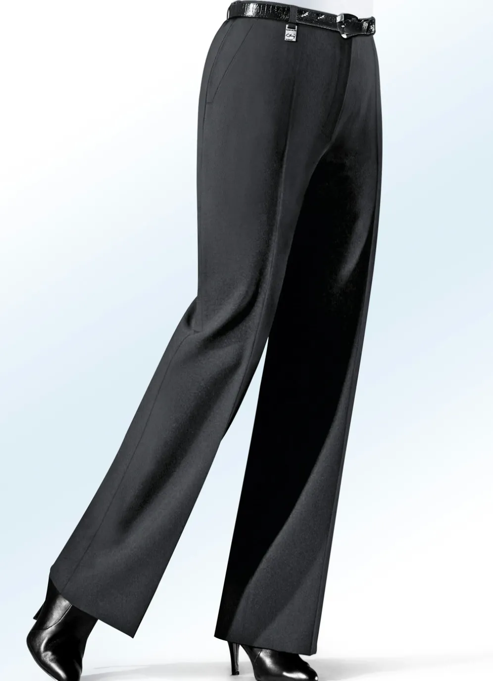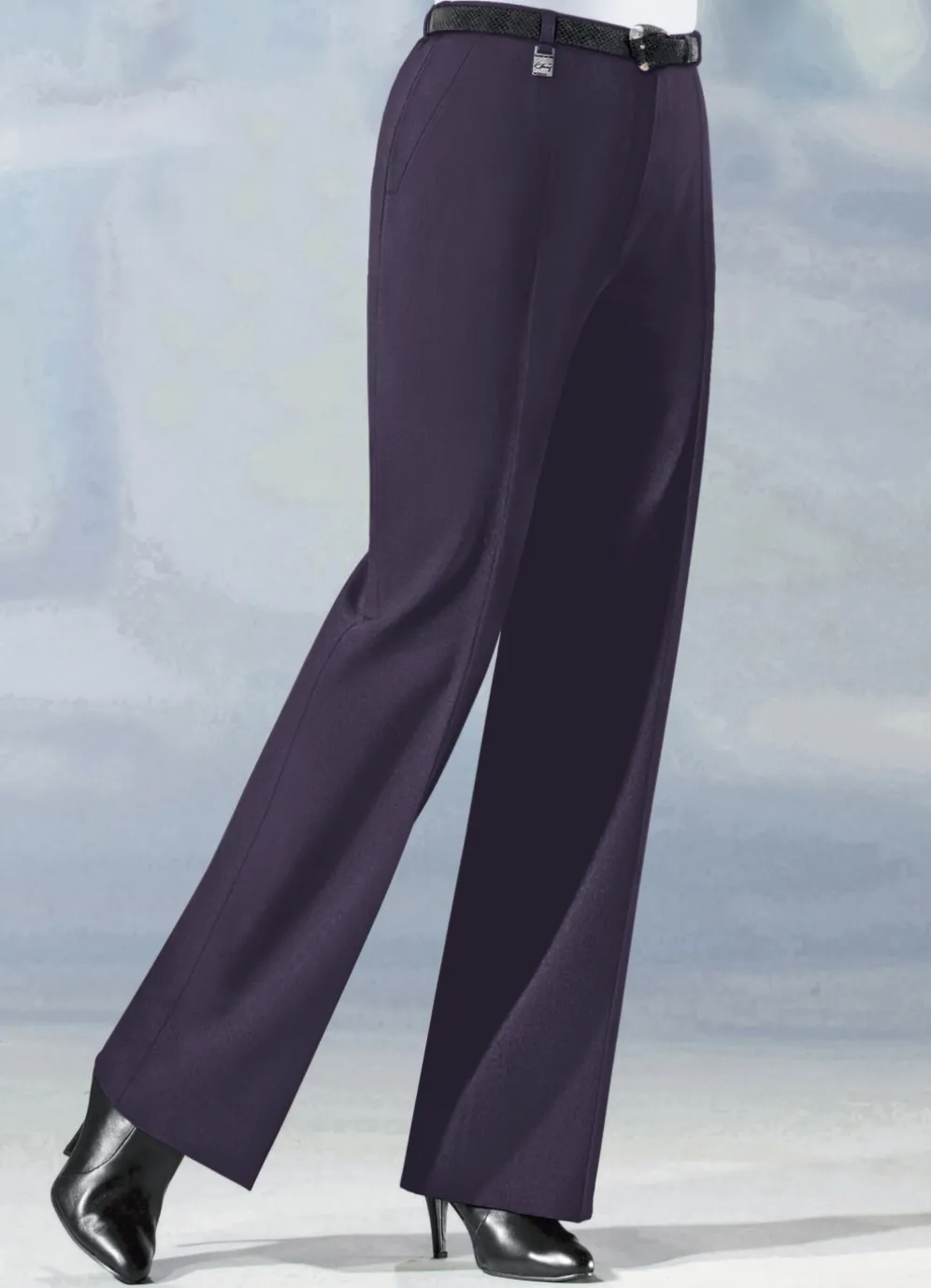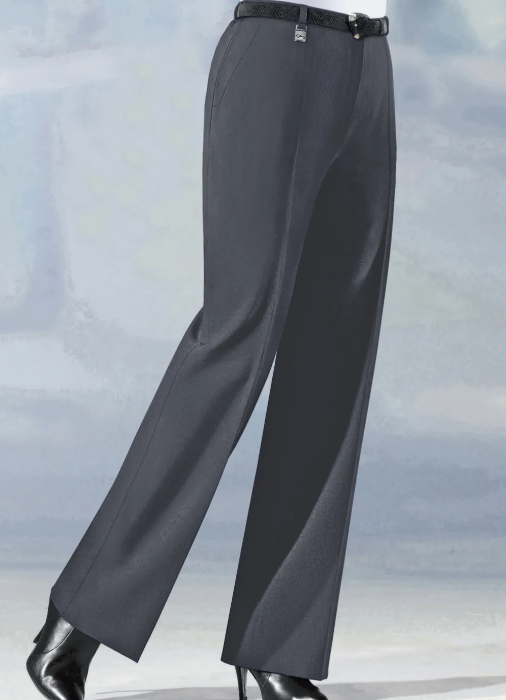 Trendstarke Hose in angesagter Marlene-Form, mit rückwärtigen Dehnbundeinsätze, aparter Zieranhänger an einer der vorderen Gürtelschlaufen, Haken- und Reißverschluss sowie Seitentaschen. Innenbeinlänge ca. 79 cm, Fußweite ab 54 cm.