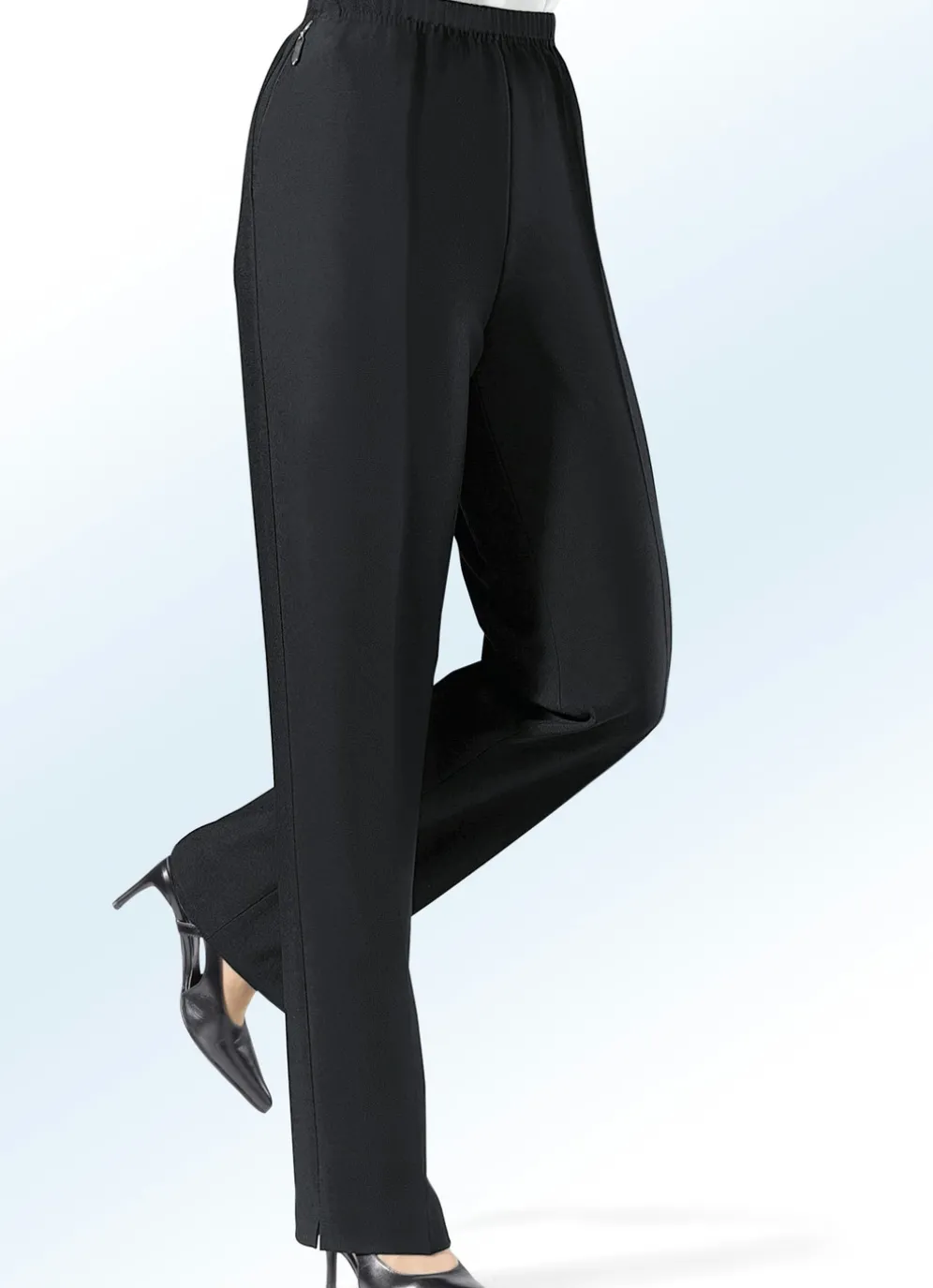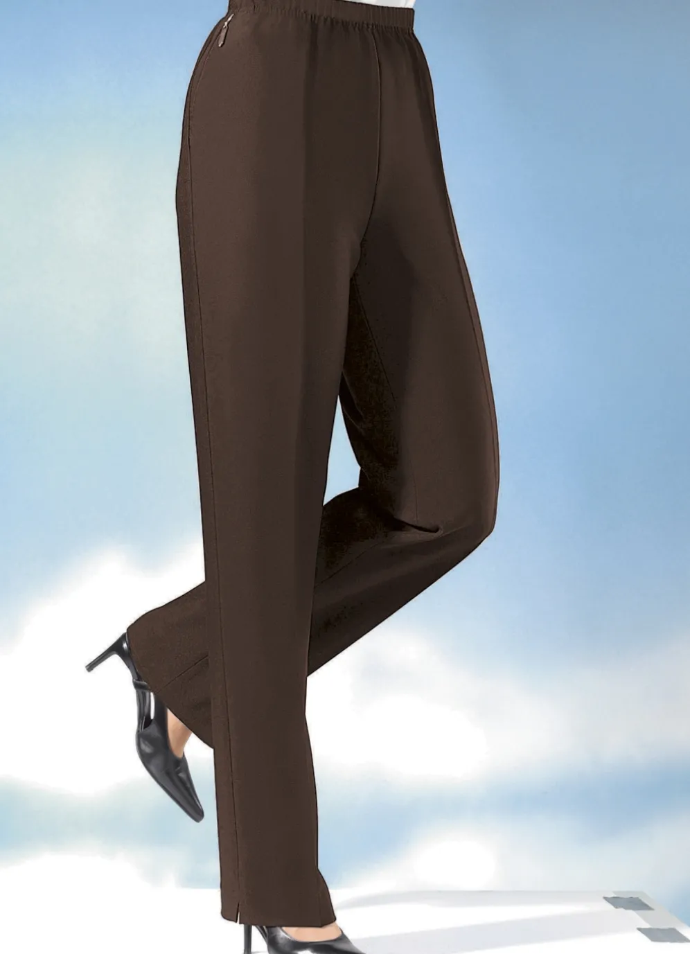 Ansprechende Hose in bequemer Schlupfform: Dehnbund rundum, Reißverschluss und Zieranhänger an den Seitentaschen, seitliche Schlitze an den Beinabschlüssen. Innenbeinlänge ca. 76 cm, Fußweite ab 43 cm.