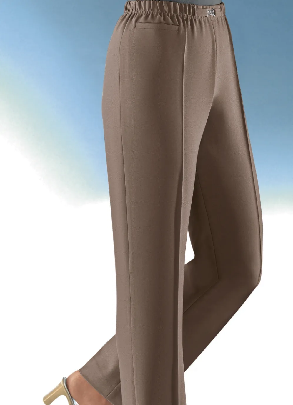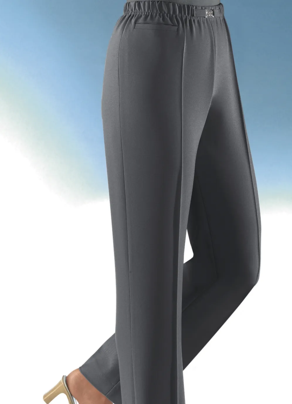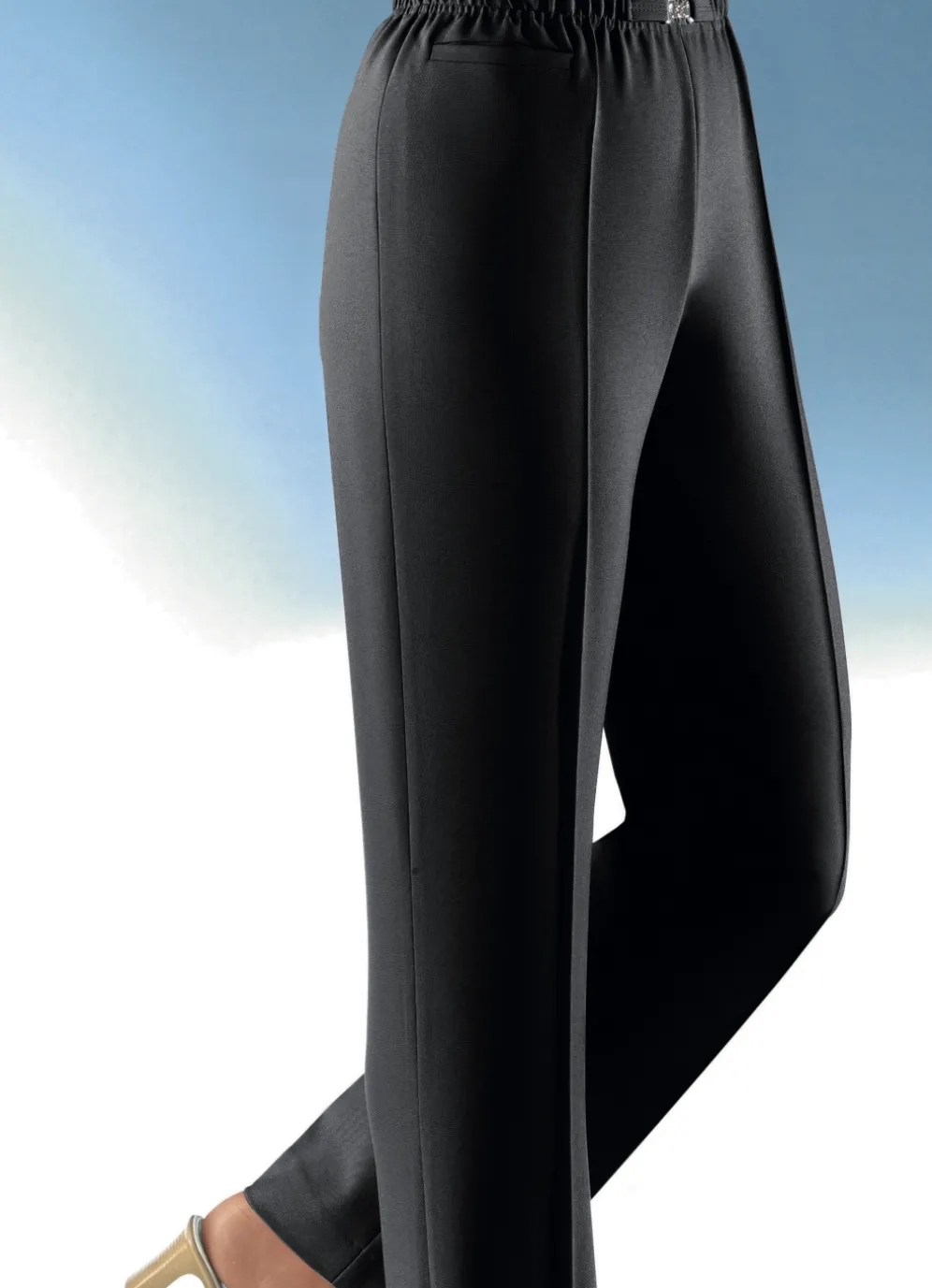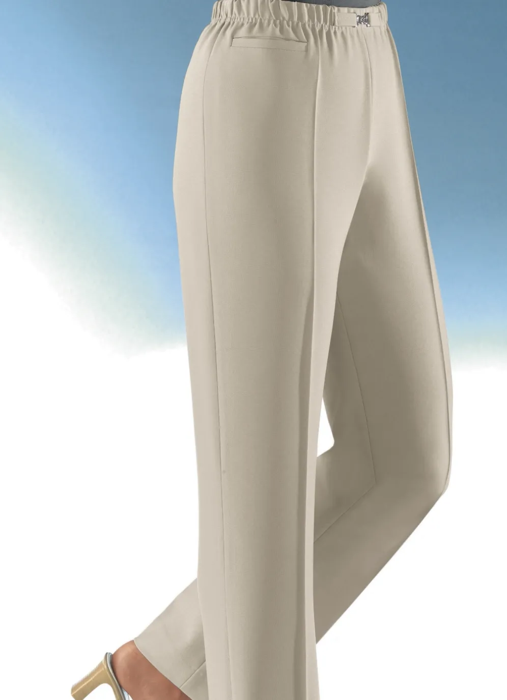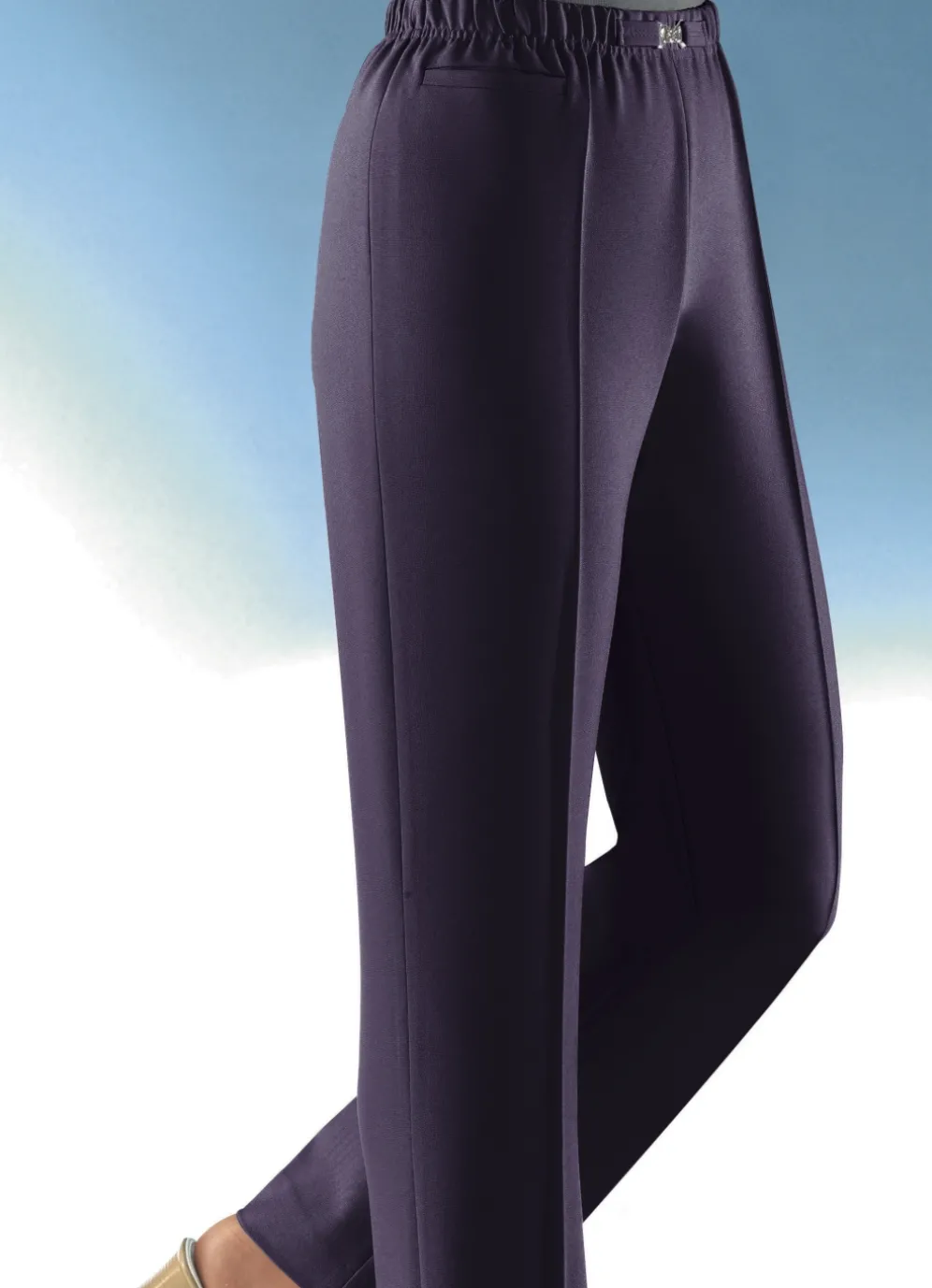 Aparte Hose in Schlupfform: Dehnbund rundum, schmückendes Zierteil vorne am Bund, paspelierte Seitentasche sowie Seitenschlitze. Innenbeinlänge ca. 75 cm, Fußweite ab 42 cm.