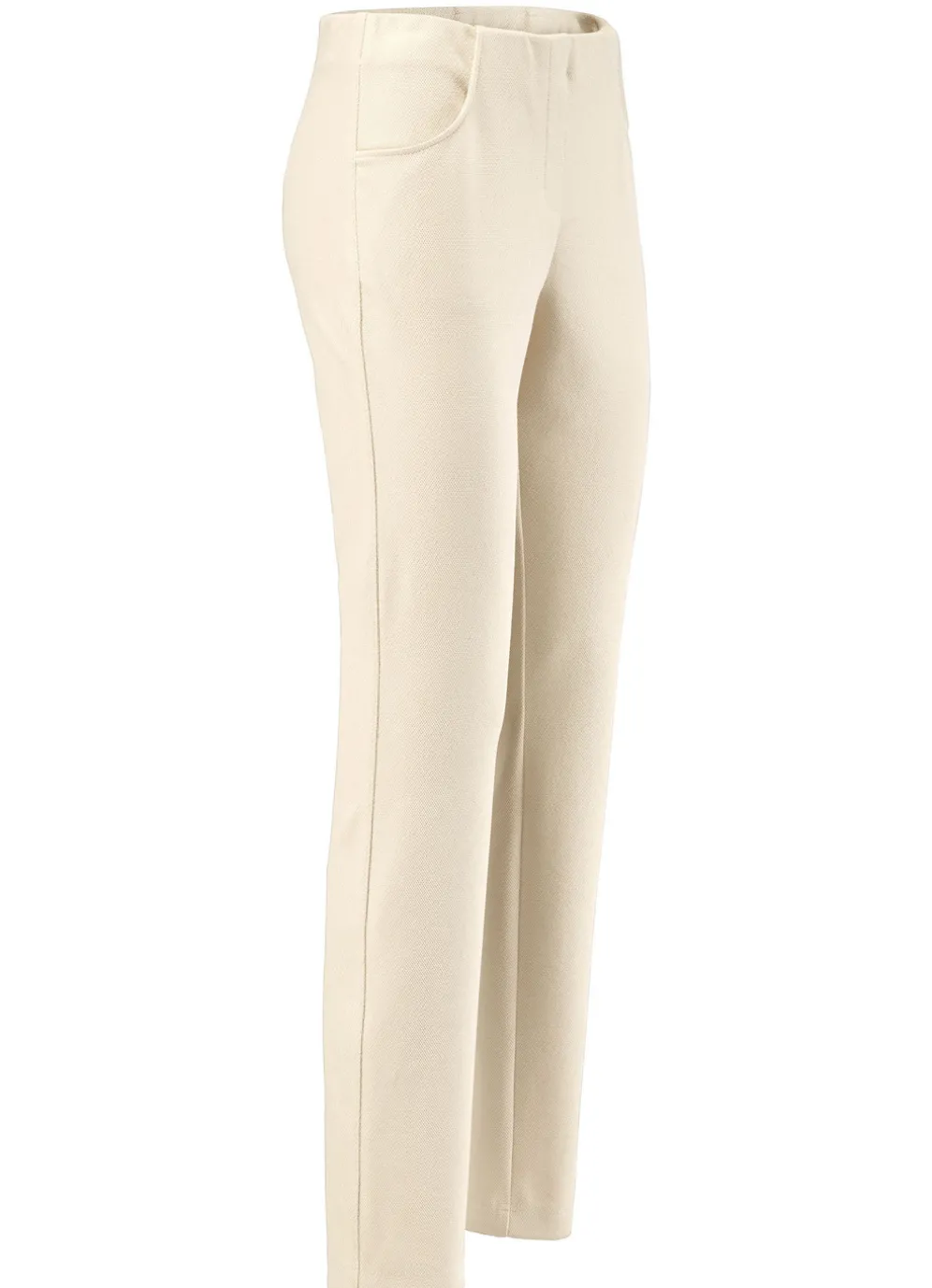 Attraktive Hose mit angeschnittenem Bund: in bequemer Schlupfform, glatt anliegend dank des innenliegenden Rundum-Dehnbundes, angedeutete Reißverschlusszierblende sowie Seitentaschen. Innenbeinlänge ca. 79 cm, Fußweite ab 30 cm.