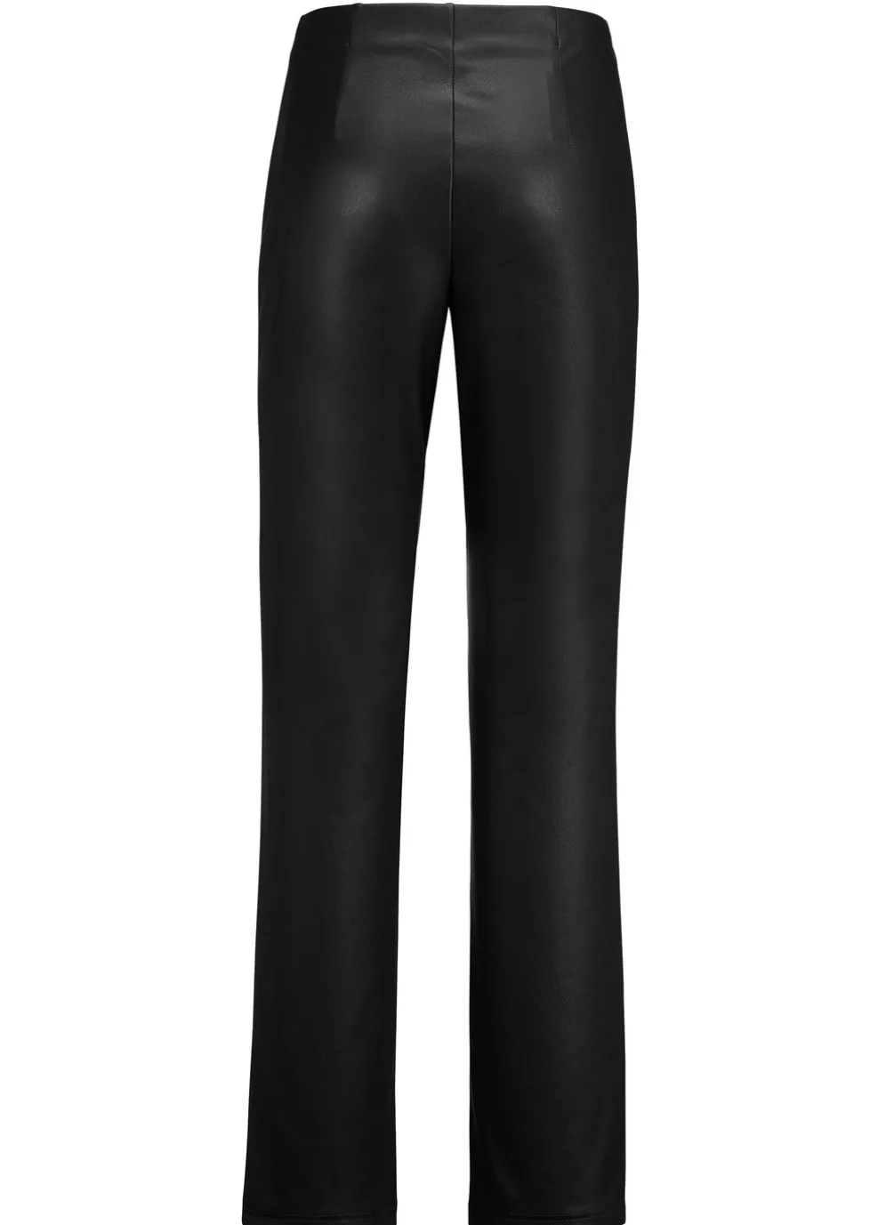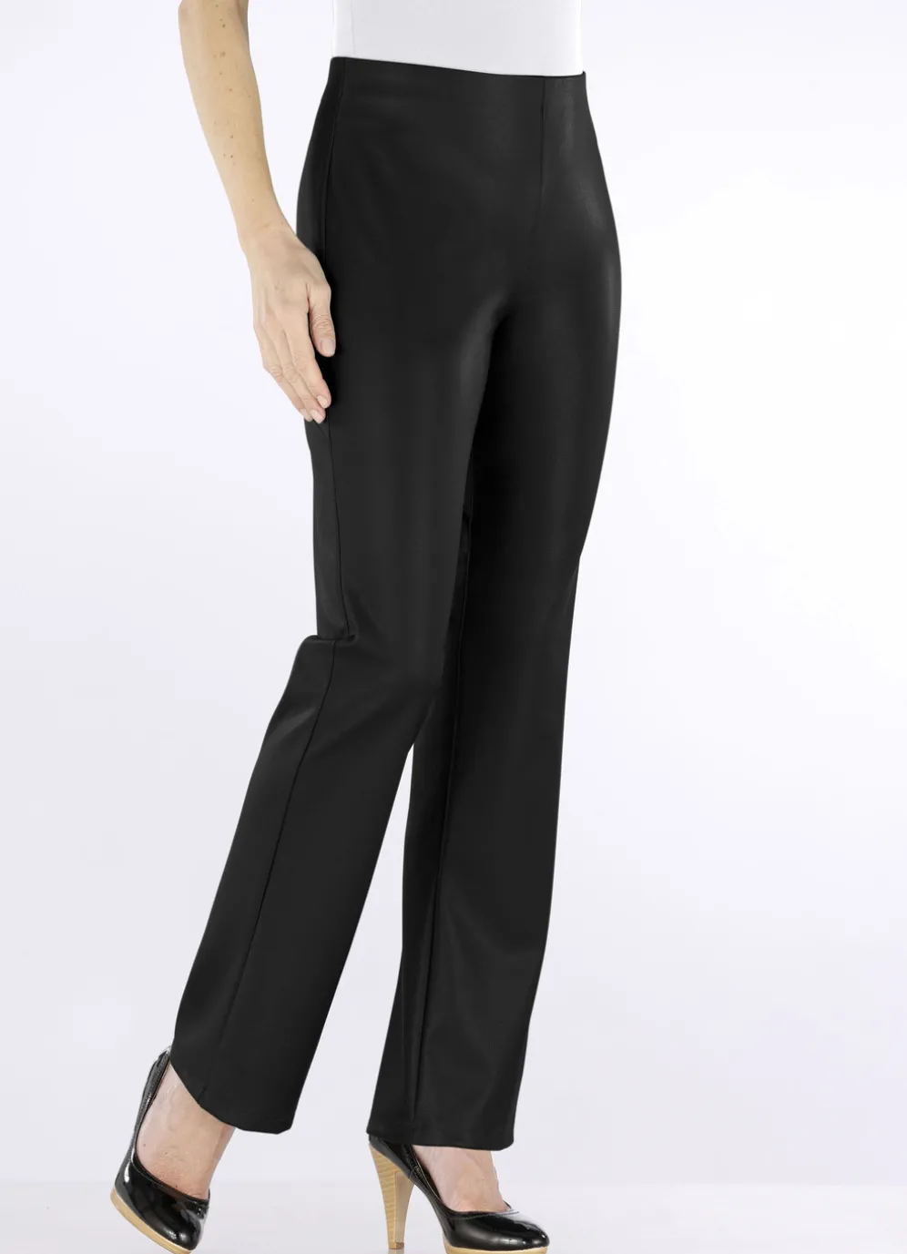 Ihr Modell PEGGY – attraktive Hose aus softem Nappaleder-Imitat mit ausgestellter Fußweite: in Schlupfform mit angeschnittenem, erhöhtem Stretchbund für eine figurformende, schlanke Passform. Innenbeinlänge ca. 78 cm, Fußweite ab 46 cm.