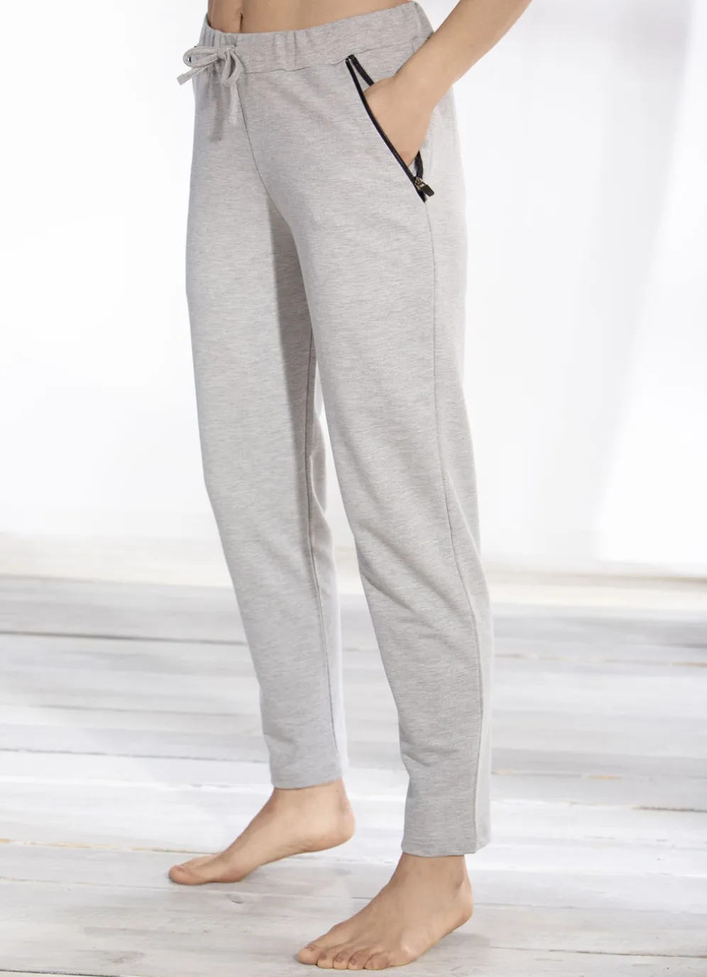 Komfortable Plantier Hose in langer, gerader Form, mit bequemem Dehnbund rundum, Tunnelzugband sowie zwei Schubtaschen mit Reißverschluss.