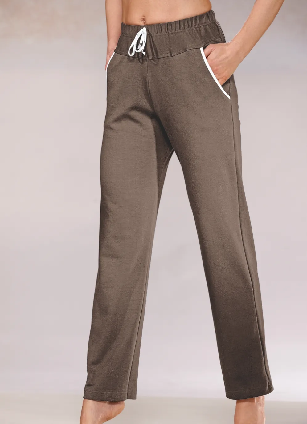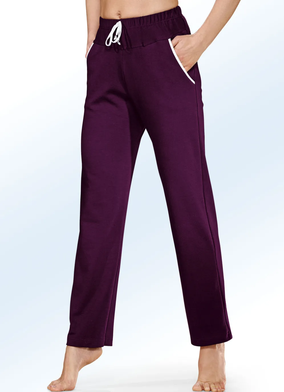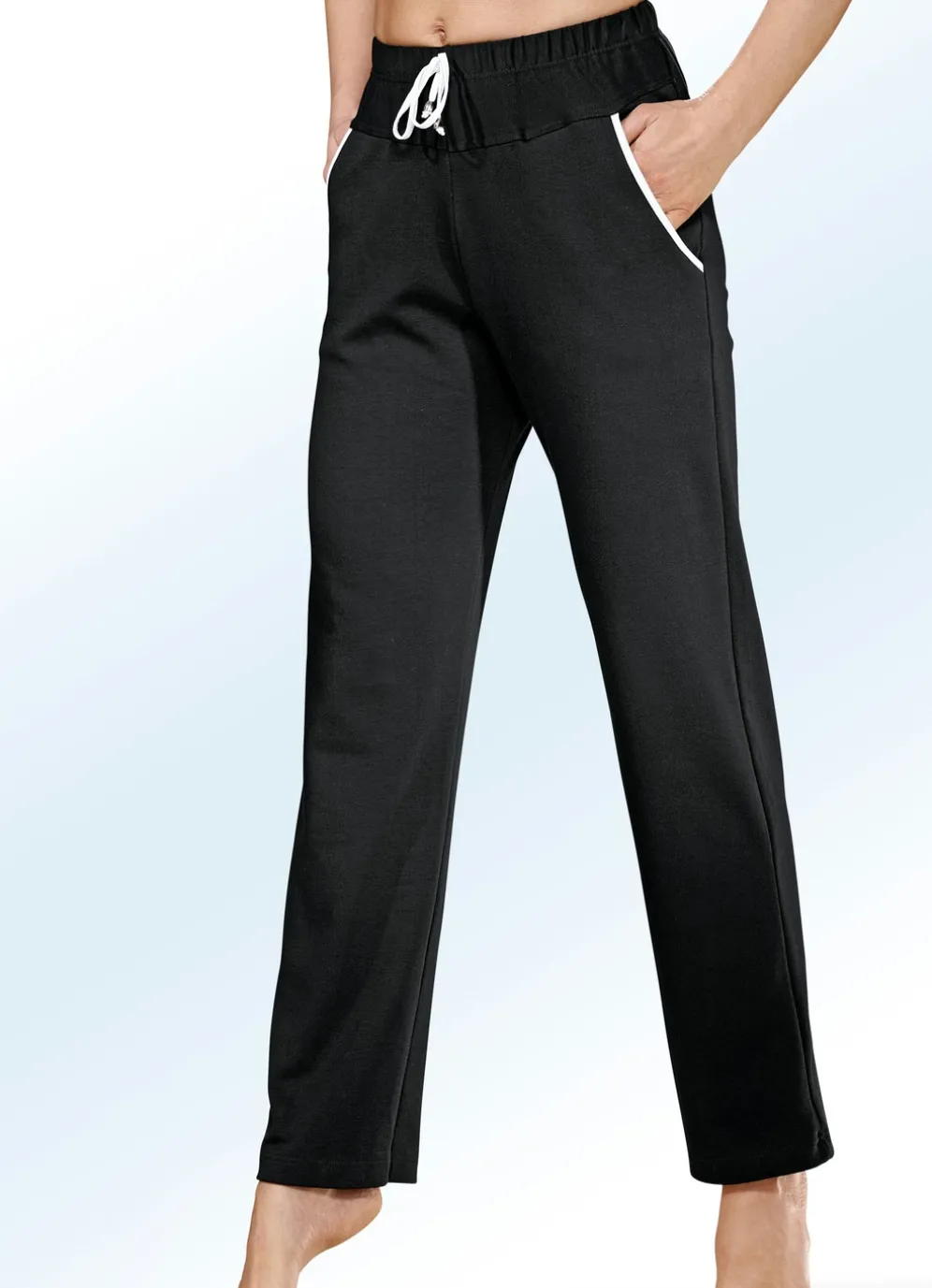 Interessante Hose in langer Form, mit kontrastfarbenem Zierband am bequemen Dehnbund sowie weißer Paspelierung an den beiden Schubtaschen.