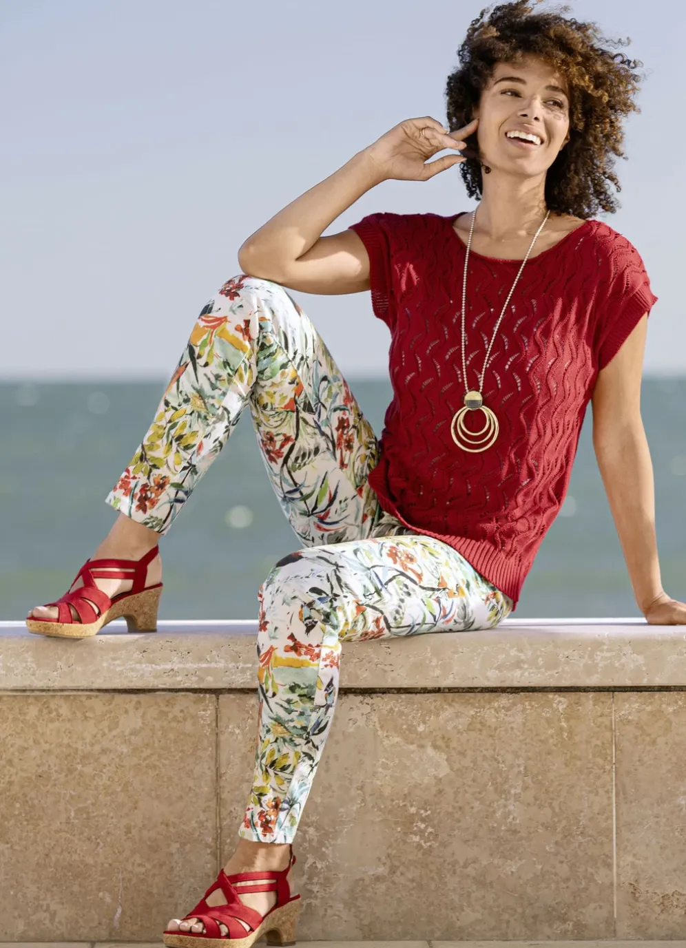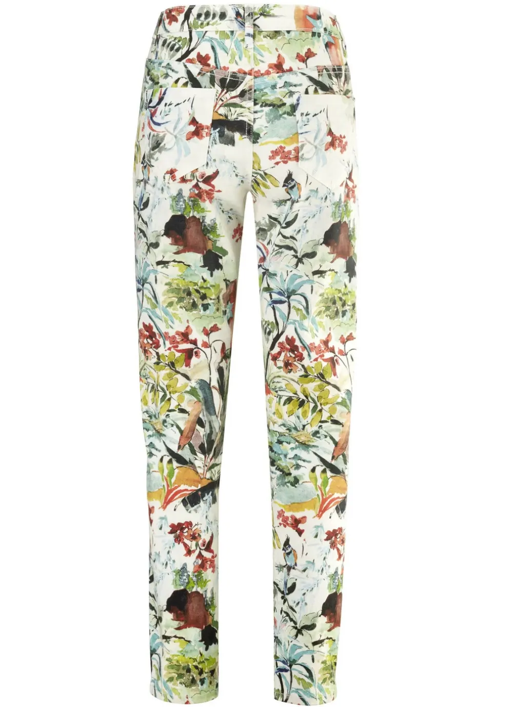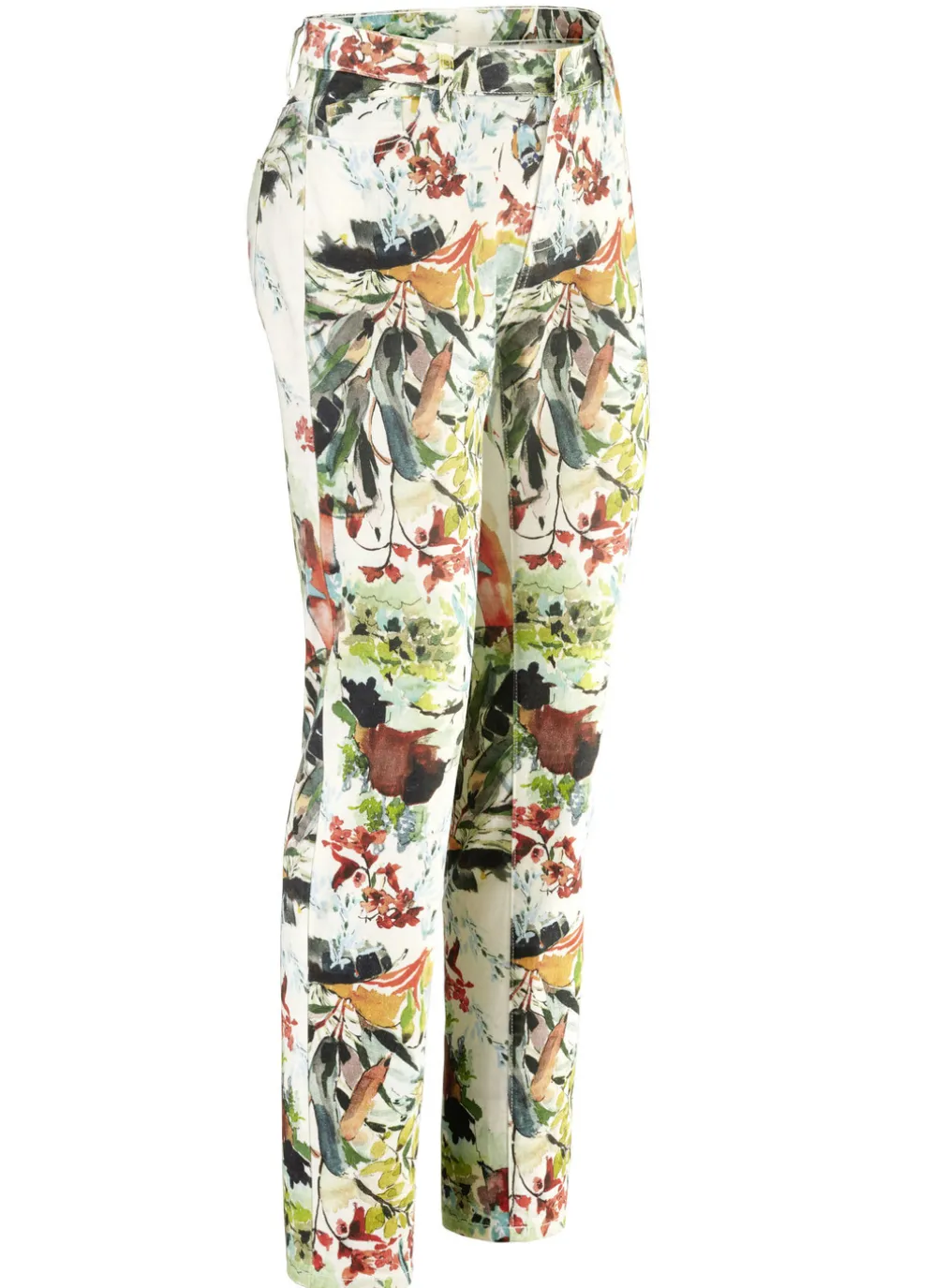 Flotte Hose in bewährter 5-Pocket-Form mit farbbrillantem Druck in Ecru-Grün-Orange-Bunt: elastischer Formbund, Gürtelschlaufen, Knopf- und Reißverschluss sowie figurformende Passe im Rückteil. Innenbeinlänge ca. 78 cm, Fußweite ab 28 cm.