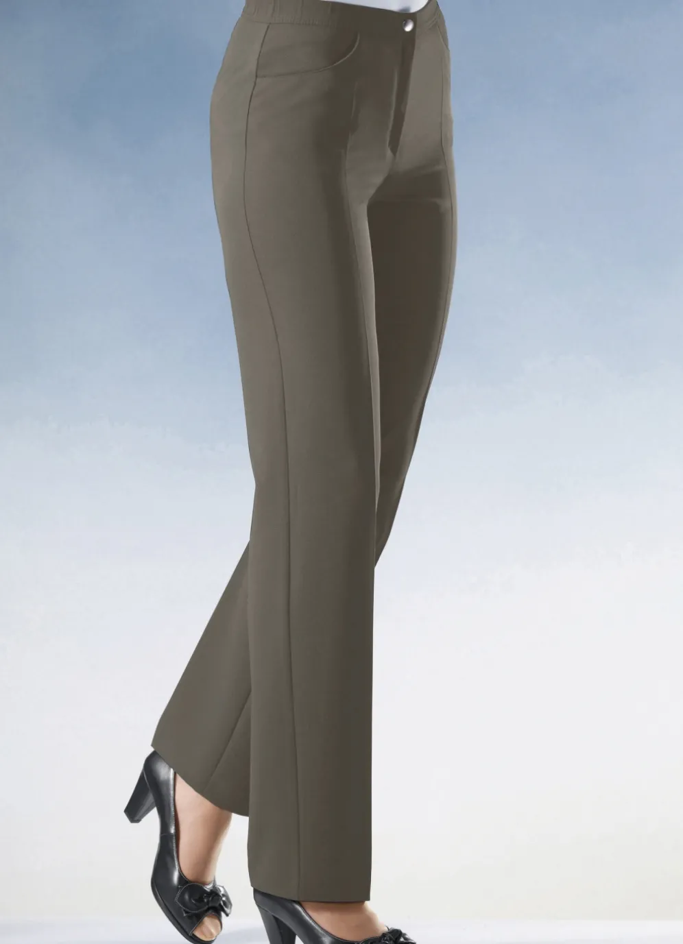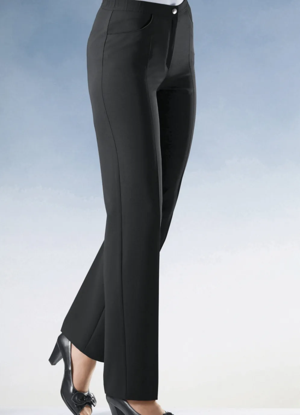 Schicke und sehr bequeme Hose mit angenehmem, komfortablem Dehnbund rundum, Haken- und Reißverschluss vorne sowie Seitentaschen. Innenbeinlänge ca. 78cm, Fußweite ab 42 cm.