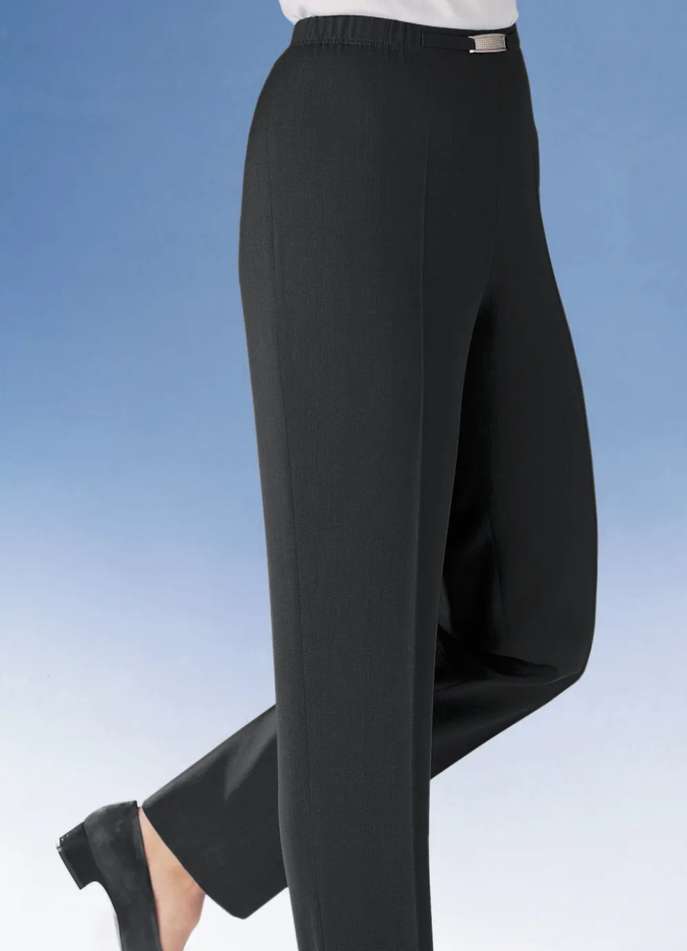 Figurfreundliche Dehnbundhose: komfortable Schlupfform, aparte Metallzier vorne am Bund. Innenbeinlänge ca. 76 cm, Fußweite ab 39 cm.