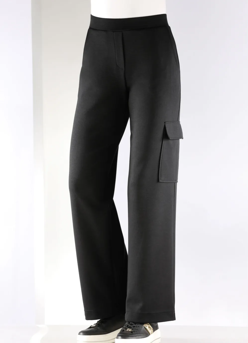 Topaktuelle, schwarze Hose in Schlupfform, glatt anliegend dank der innenliegenden Gummibund-Einlage, Reißverschluss-Zierblende, Seitentaschen sowie aufgesetzte Pattentasche in Cargo-Optik. Innenbeinlänge ca. 79 cm, Fußweite ab 48 cm.