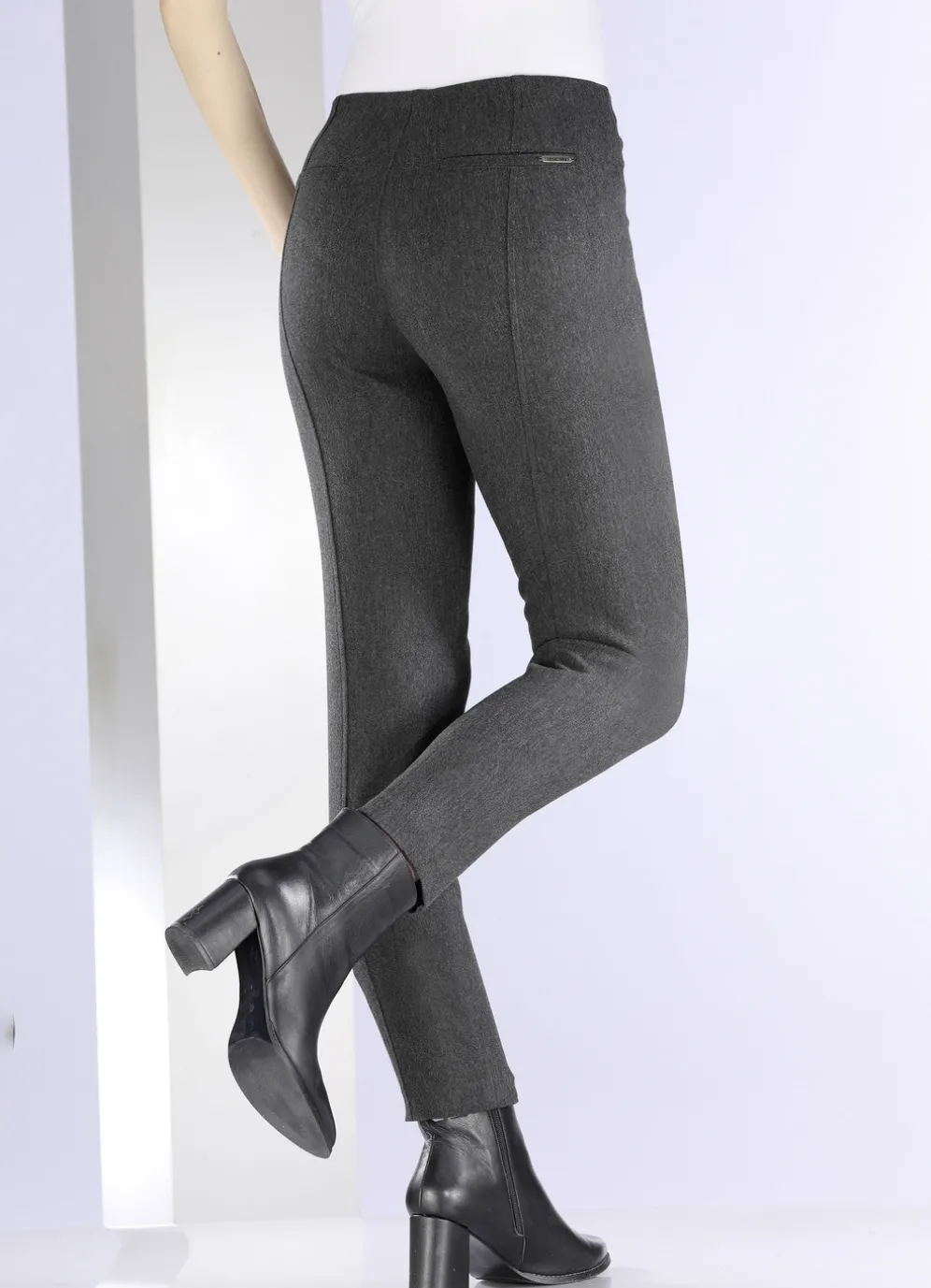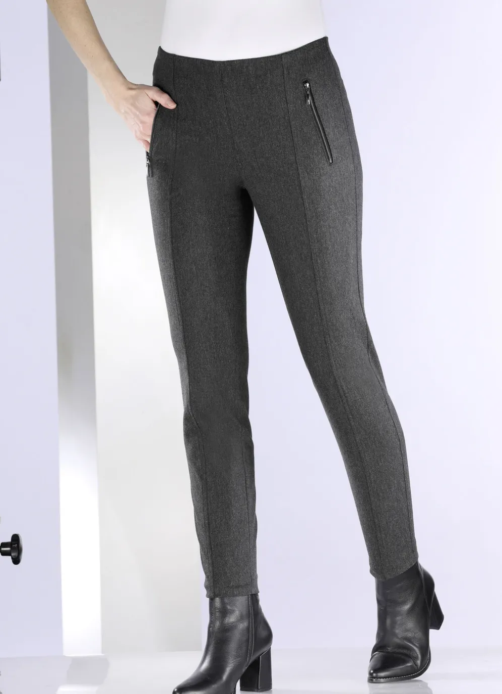 Ansprechende Hose in ausgezeichneter Qualität mit angeschnittenem Bund, glatt anliegend dank der innenliegenden Gummibund-Einlage, Reißverschluss-Taschen vorne, streckende Teilungsnähte im Vorder- und Rückteil sowie paspelierte Gesäßtaschen. Innenbeinlänge ca. 77 cm, Fußweite ab 28 cm.