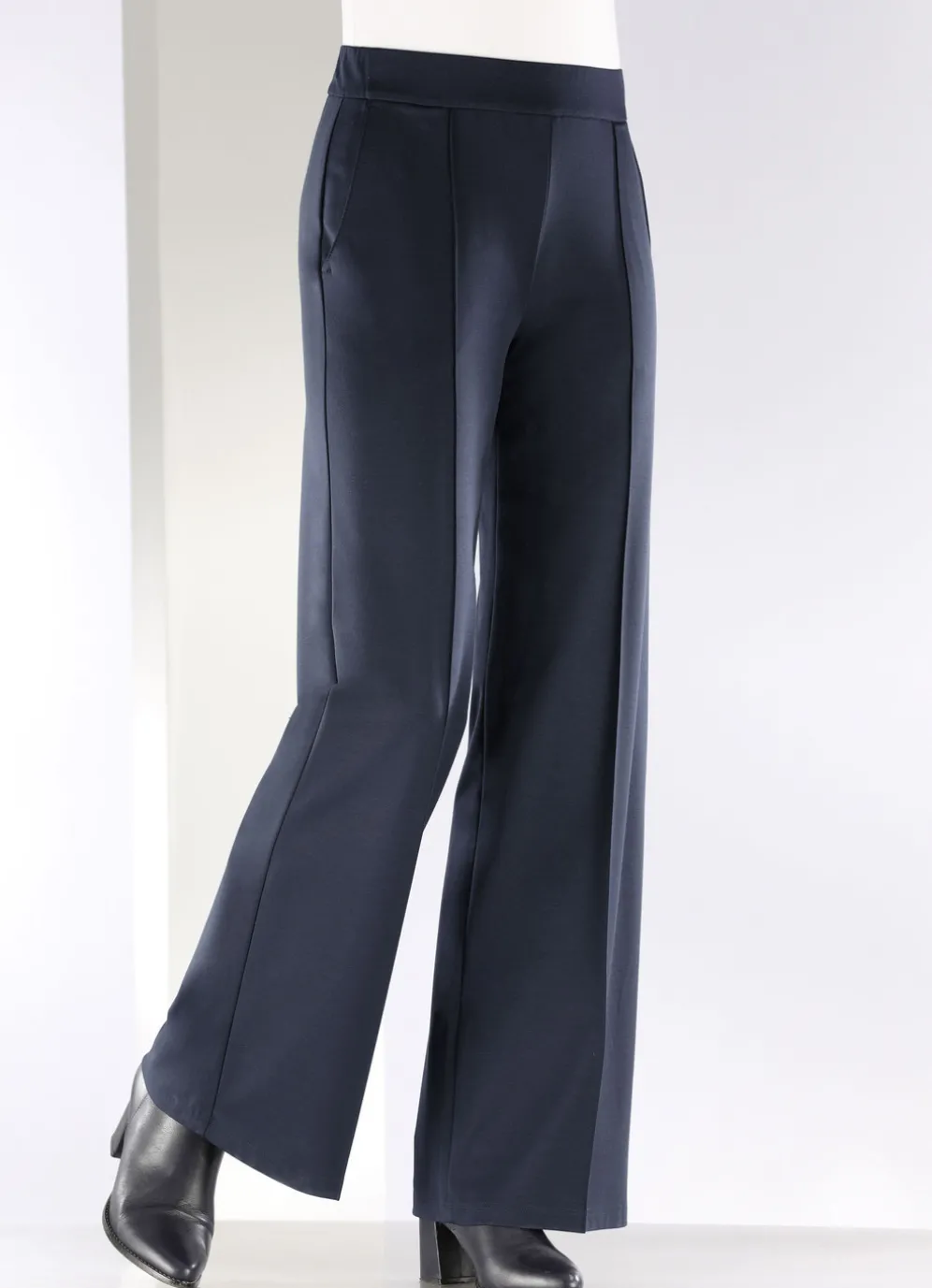 Fabelhafte Hose mit modisch weitem, leicht ausgestelltem Beinverlauf in Schlupfform, glatt anliegend dank des innenliegenden Rundum-Dehnbundes, Seitentaschen sowie streckende, abgesteppte Biesen im Vorderteil. Innenbeinlänge ca. 80 cm, Fußweite ab 60 cm