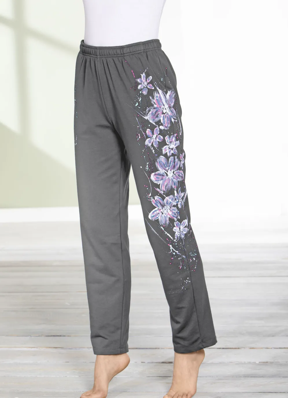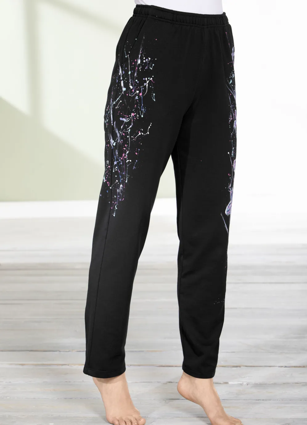 Jedes Teil ein Unikat! Diese lange Hose mit bequemem Dehnbund rundum, Kordelzug und zwei Schubtaschen überzeugt mit einem Spraydruck im Vorderteil.