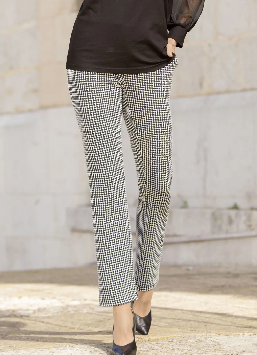 Außergewöhnlich gestylte Hose mit trendiger Hahnentritt-Dessinierung in Schwarz-Weiß: in bequemer Schlupfform, glatt anliegend dank des innenliegenden, unsichtbaren Rundum-Dehnbundes sowie Seitentaschen. Innenbeinlänge ca. 78 cm, Fußweite ab 36 cm.