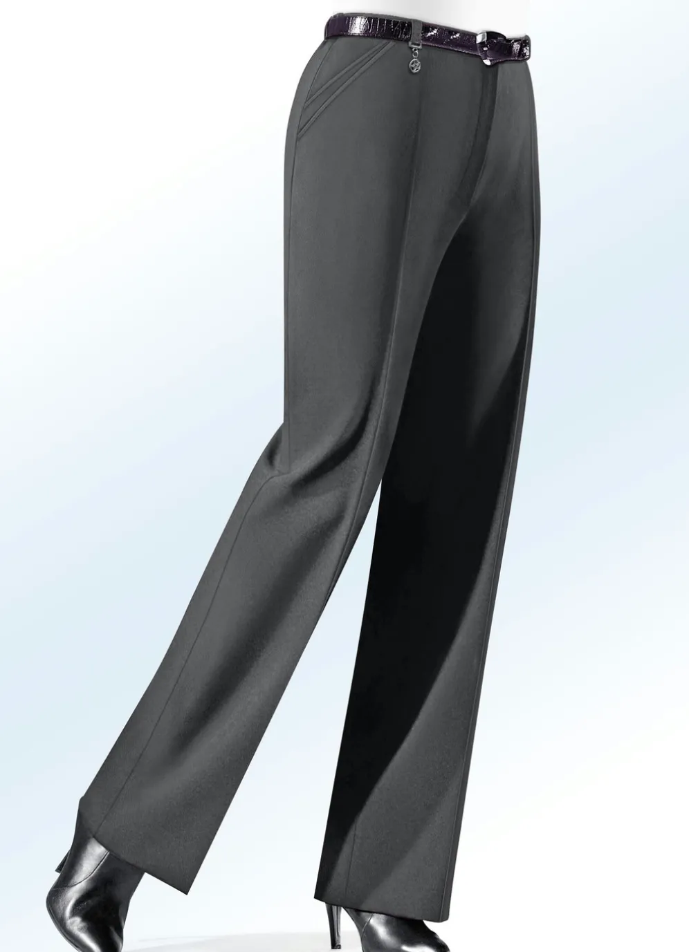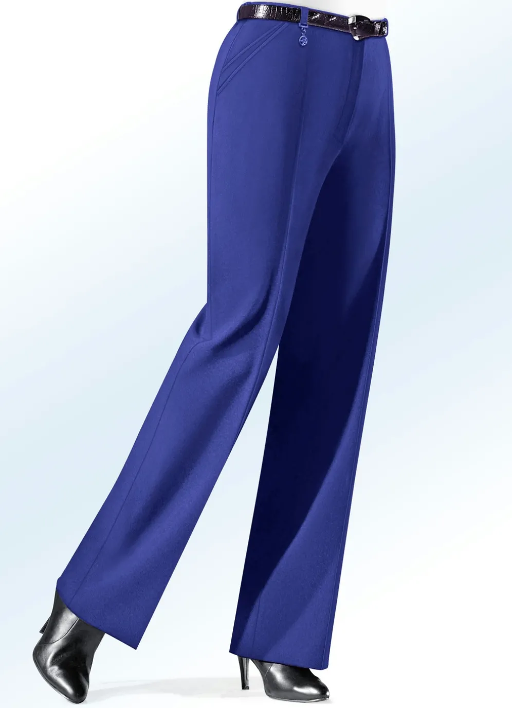 In bester Qualität und Verarbeitung zeigt sich diese attraktive Hose mit modisch ausgestellter Fußweite: rückwärtige Dehnbundeinsätze, aparter Zieranhänger an einer der vorderen Gürtelschlaufen, Haken- und Reißverschluss sowie Seitentaschen mit interessantem Blenden-Effekt. Innenbeinlänge ca. 79 cm, Fußweite ab 54 cm.