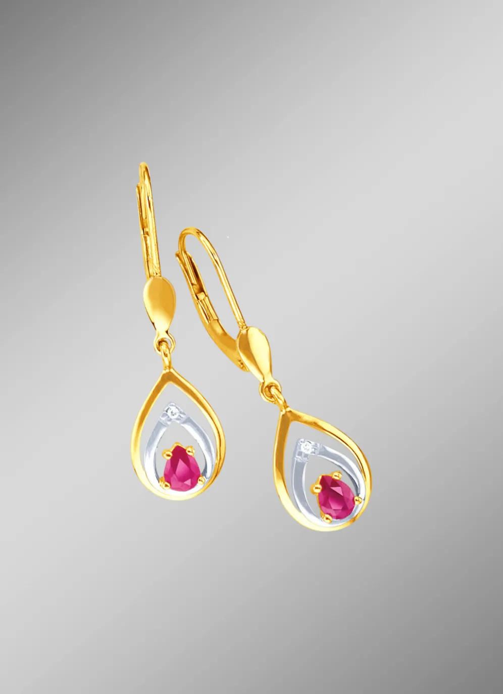 Von atemberaubende Schönheit sind diese hübschen Ohrringe, wahlweise aus glänzendem Gold 585/- fein oder Gold 333/- fein. Absolutes Highlight sind die edlen Rubin-Tropfen, zusammen 0,38 ct., die in ihrer vollen Pracht erstrahlen. Dazu funkeln 2 Brillanten, Weiß, Piqué 1.