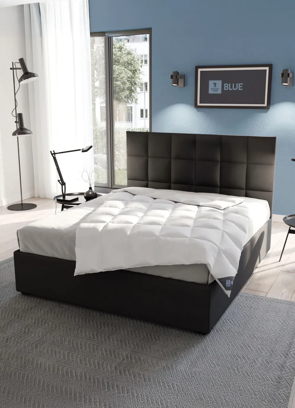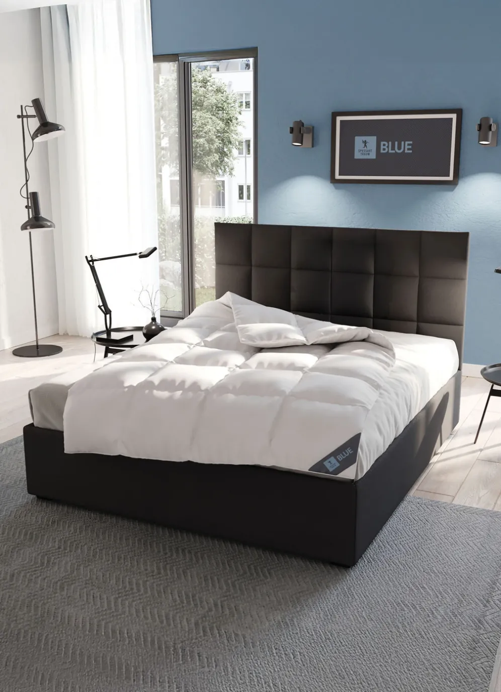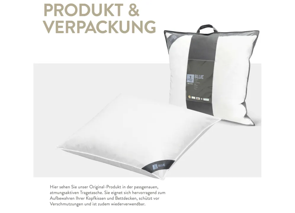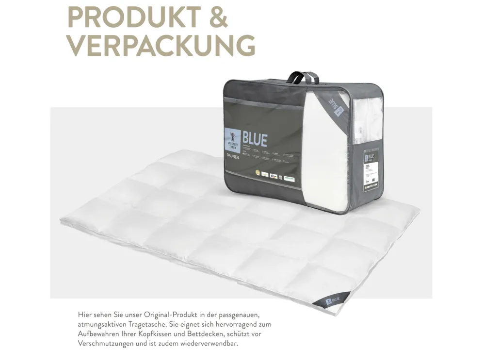 In Deutschland hergestelltes Daunenprogramm aus dem Hause Spessarttraum in der Ausführung Blue Kissen und in Größe 121 (40/ 80 cm).