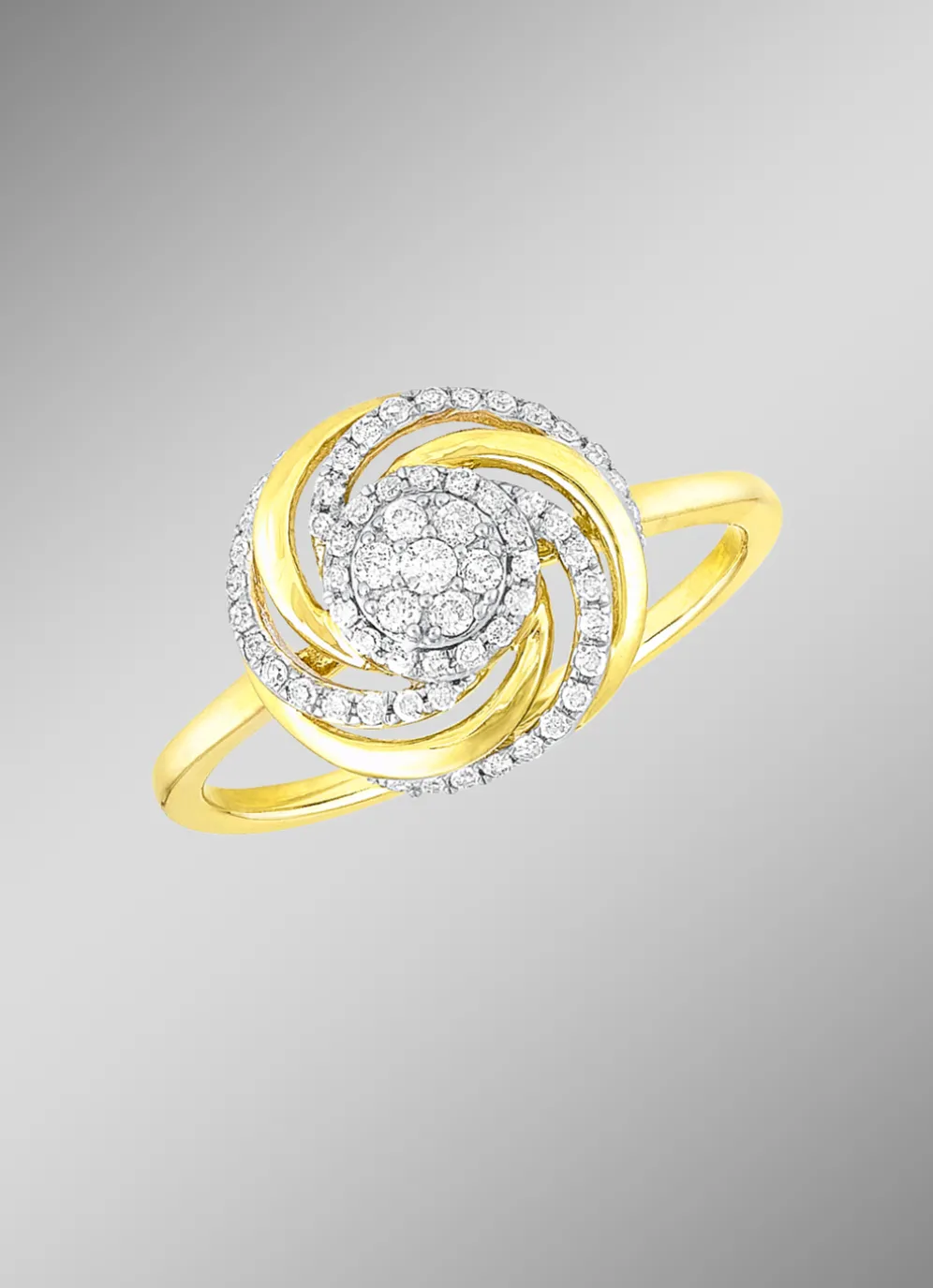 In interessantem Design: Dieser schön geschwungene Damenring zaubert einen unvergesslichen Charme an Ihre Hand. Der Ringkopf mit einem Durchmesser von 12 mm ist mit 7 Brillanten und 49 Diamanten, zusammen ca. 0,25 ct., in Weiß, Piqué 2, besetzt. Das Schmuckstück aus Gold 585/- fein verbindet ein elegantes Design mit funkelndem Luxus. Erfreuen Sie sich schon bald selbst an diesem schwungvollen, edlen Ring