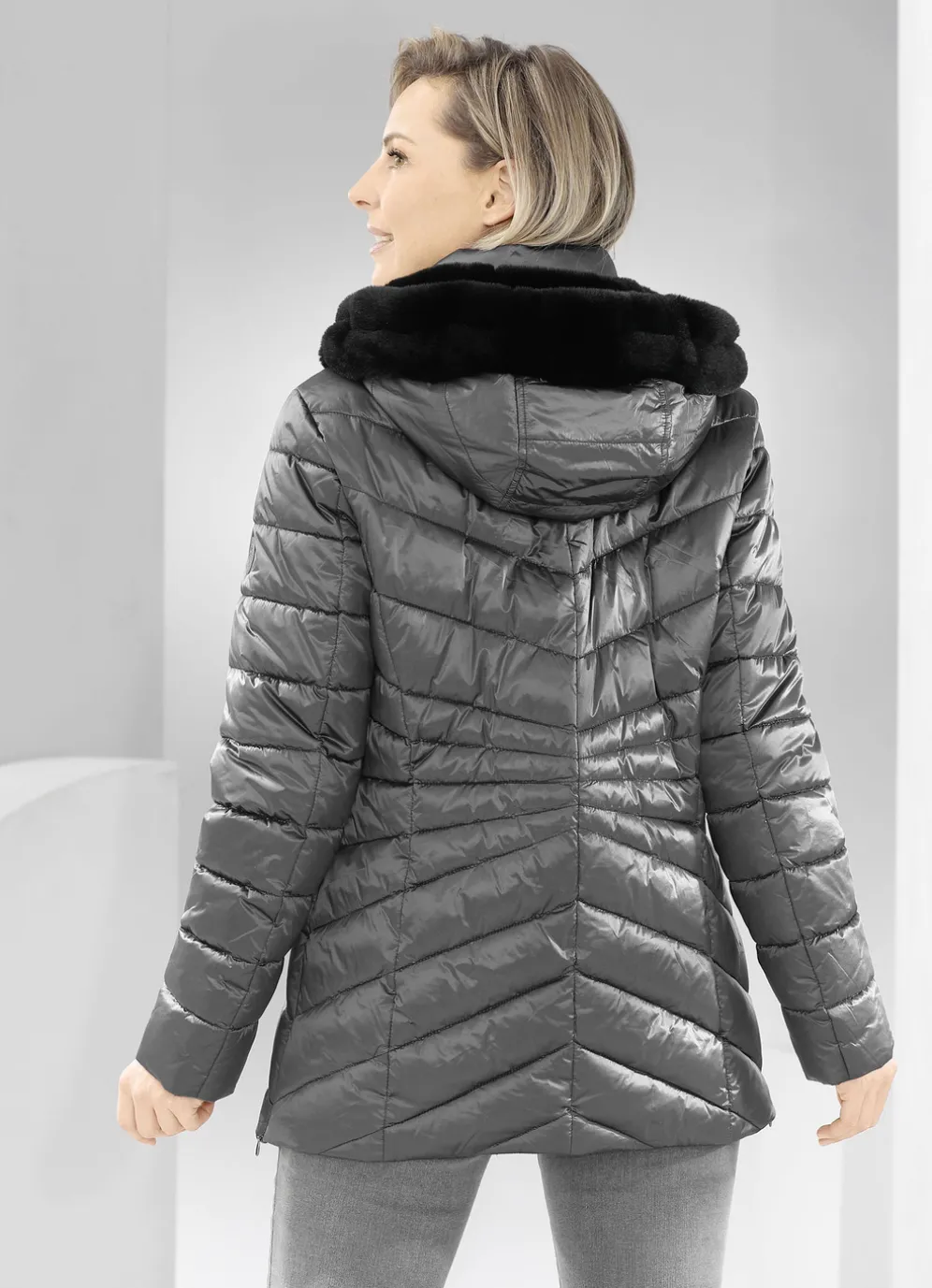 Jacke mit Durchzugsband, Stopper und Kunstpelz-Innenausstattung in der abnehmbaren Kapuze, durch Reißverschluss hoch schließbarem Stehkragen, Reißverschluss an den Taschen und Seitenschlitzen sowie einer Innentasche. Länge ca. 72 cm, ab Gr. 44 ca. 74 cm, ab Gr. 46 ca. 76 cm.