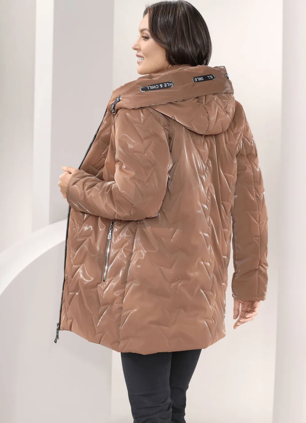 In topmodischer Lackoptik zeigt sich diese Jacke mit Durchzugsband und Stopper in der angeschnittenen Kapuze, durch 2-Wege-Reißverschluss hoch schließbarem Stehkragen sowie Reißverschlusstaschen. Länge ca. 82 cm, ab Gr. 46 ca. 84 cm.