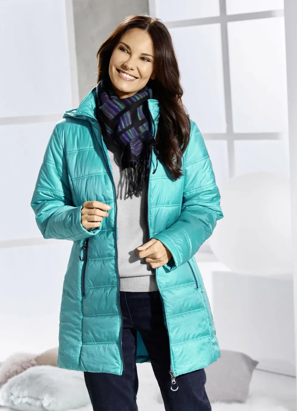Einfach klasse ist diese umwerfende Longjacke mit abnehmbarer Kapuze, durch 2-Wege-Reißverschluss hoch schließbarem Stehkragen, Reißverschlusstaschen sowie einer Innentasche. Länge ca. 84 cm.