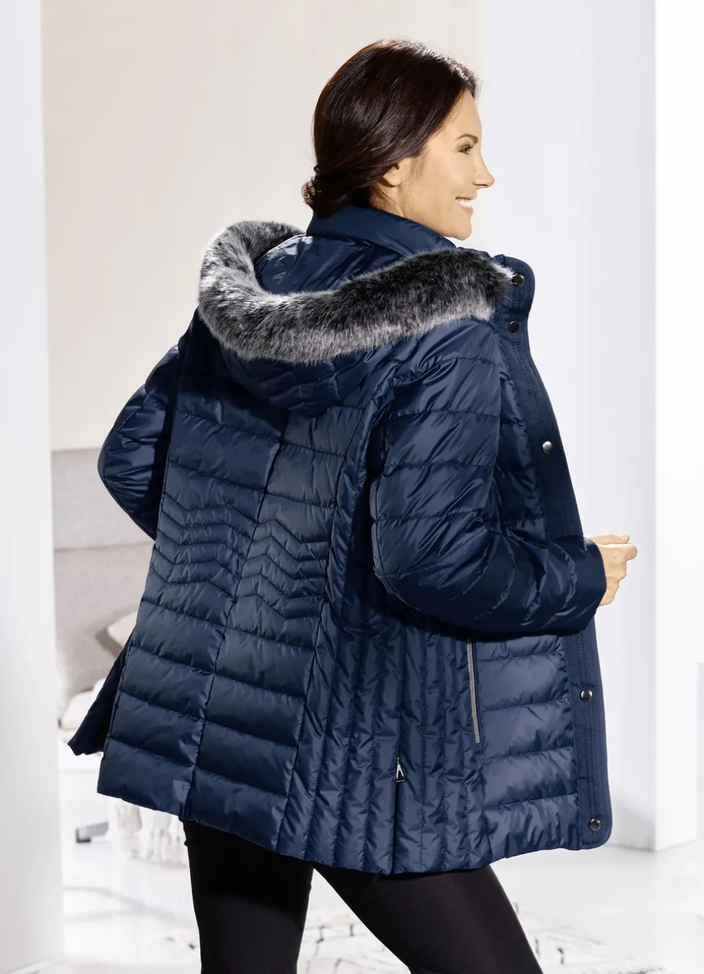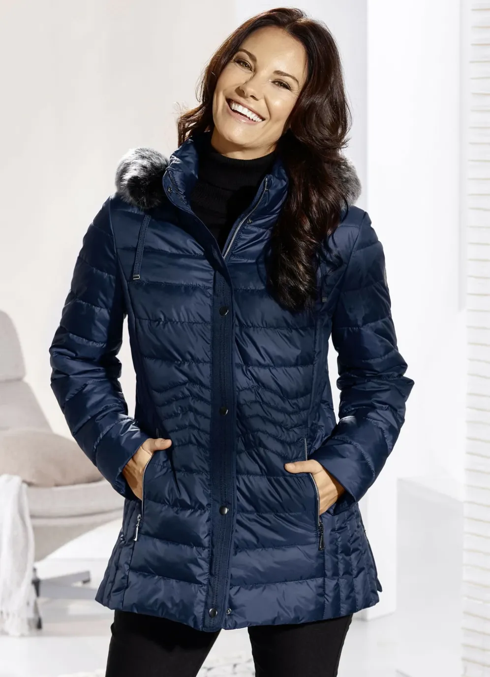 Tolle, navyblaue Jacke mit figurfreundlicher Längssteppung seitlich: abnehmbare Kapuze mit Durchzugsband, Stopper und abnehmbarem Kunstpelz-Besatz, durch Reißverschluss unter der Druckerleiste hoch schließbarer Stehkragen, Reißverschluss an Taschen und Seitenschlitzen, umschlagbare Ärmel sowie eine Innentasche. Länge ca. 72 cm, ab Gr. 42 ca. 74 cm, ab Gr. 46 ca. 76 cm, ab Gr. 50 ca. 78 cm.
