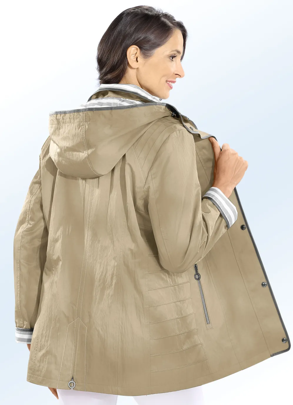 Pfiffig gestylte Jacke mit Akzenten aus Nappaleder-Imitat, Durchzugsband und Stopper in der Kapuze, durch Reißverschluss unter der Druckerleiste hoch schließbarem Steh-Umlegekragen, Reißverschlusstaschen, umschlagbaren Ärmeln in Kontrast, einer Innentasche sowie Gehschlitz mit Reißverschluss. Länge ca. 74 cm, ab Gr. 46 ca. 76 cm, ab Gr. 54 ca. 78 cm.