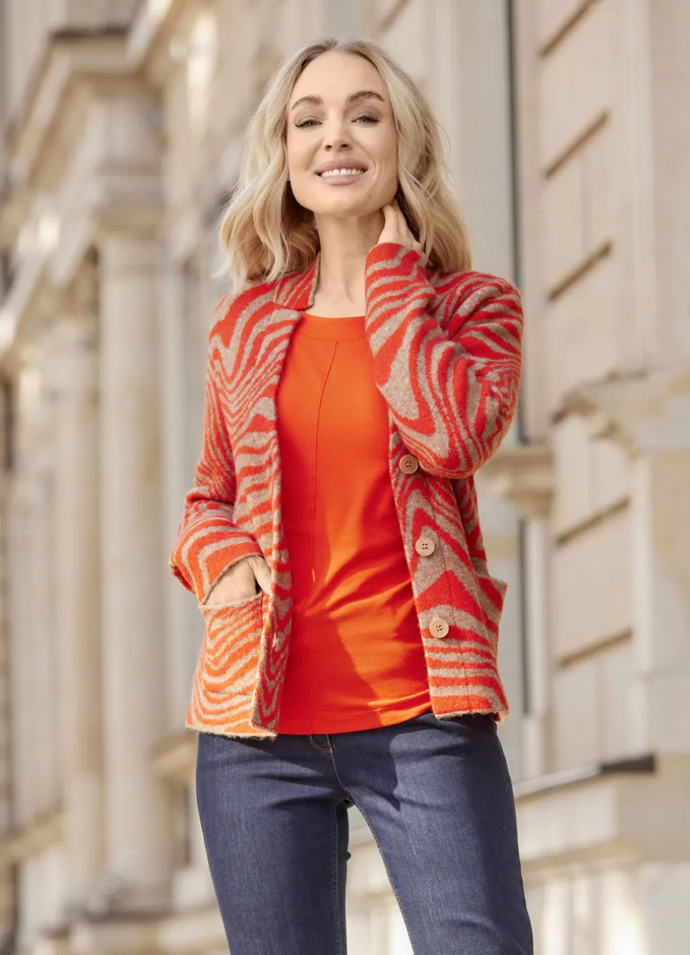 Jacke von B/ANCA in Taupe-Orange, mit V-Ausschnitt, Knopfleiste, langen Ärmeln sowie zwei aufgesetzten Taschen.