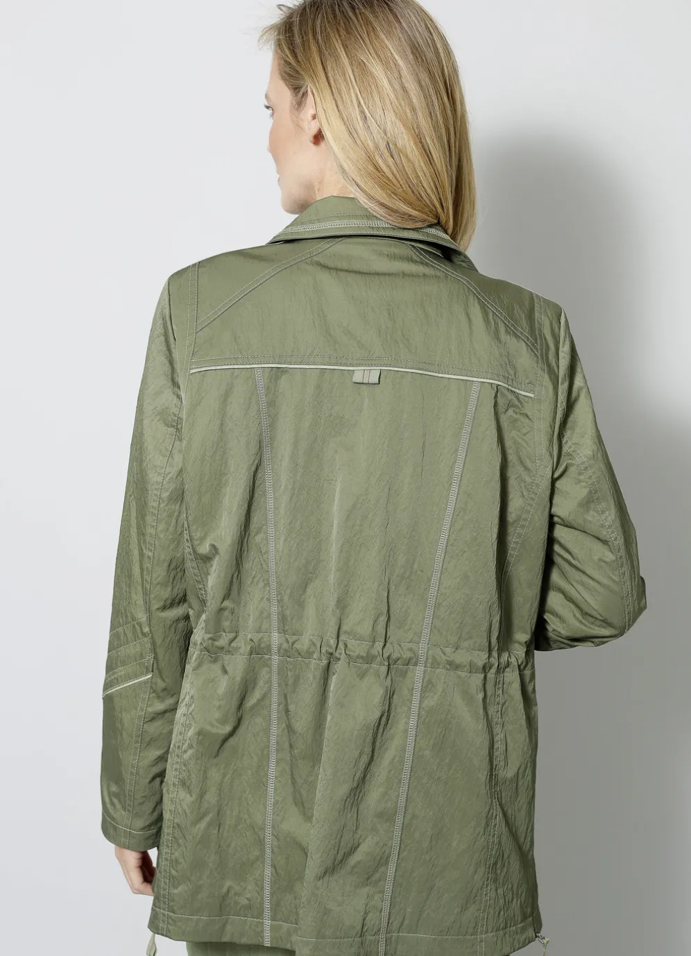 Leicht taillierte Jacke mit Steh-Umlegekragen, verdecktem Reißverschluss unter der Druckerleiste, Durchzugsband und Stopper in der Taille, Reißverschluss an den Taschen und Seitenschlitzen, umschlagbaren Ärmeln sowie einer Innentasche. Länge ca. 73 cm.