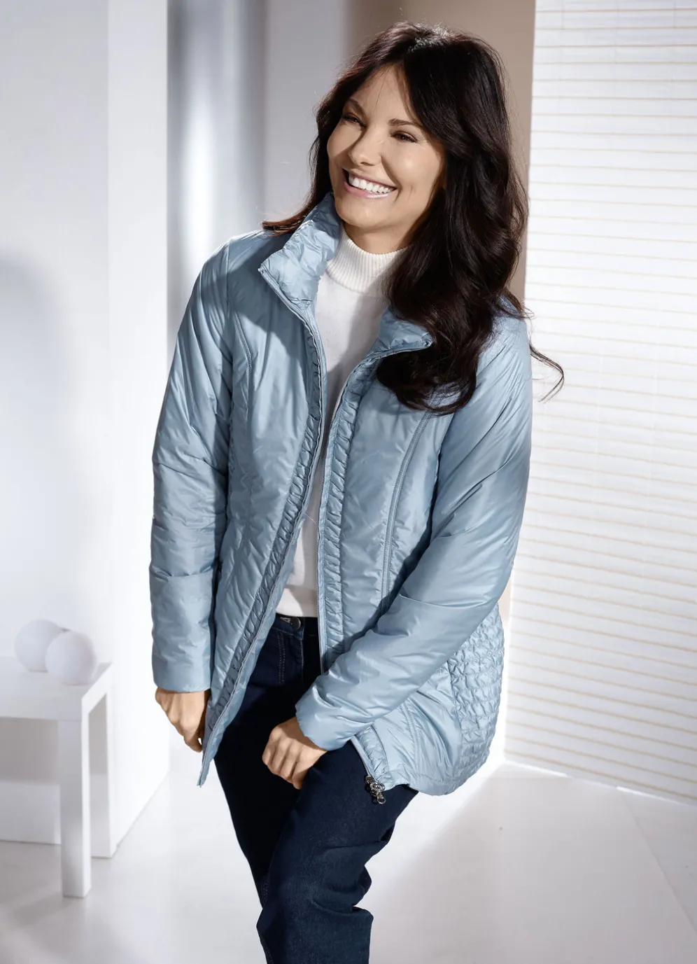 Ein idealer Begleiter ist diese Jacke in Eisblau: hoch schließbarer Stehkragen, Smokeinsätze seitlich und entlang der 2-Wege-Reißverschlussleiste, Schubtaschen mit Blende und Drucker, elastische Ärmelabschlüsse sowie eine Innentasche. Länge ca. 72 cm, ab Gr. 38 ca. 74 cm, ab Gr. 42 ca. 76 cm, ab Gr. 46 ca. 78 cm, ab Gr. 50 ca. 80 cm.