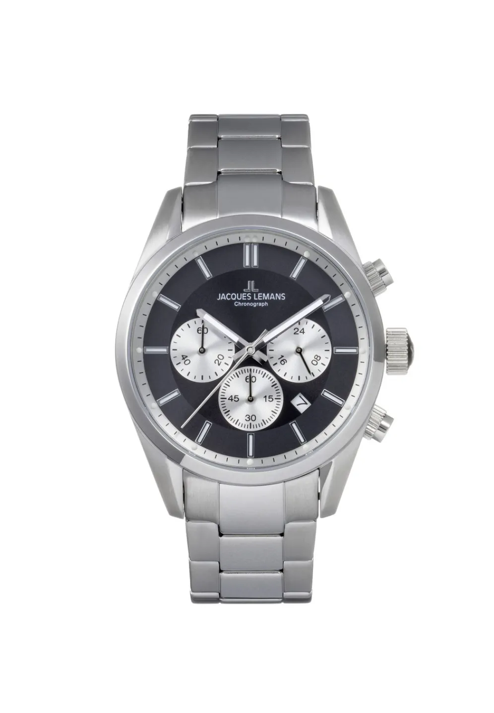 Das Modell 42-6.1E von Jacques Lemans ist ein klassisch, sportlicher Zeitmesser mit einem dezent, eleganten Touch. Das Gehäuse aus massiv Edelstahl hat einen Durchmesser von 42mm. Es umrahmt ein schönes, graues Zifferblatt mit Sonnenschliff und hellen Chronoringen für 24-Stunden Anzeige, Minuten- und Sekundenzähler und zeigt auch ein kleines Datum zwischen vier und fünf Uhr.