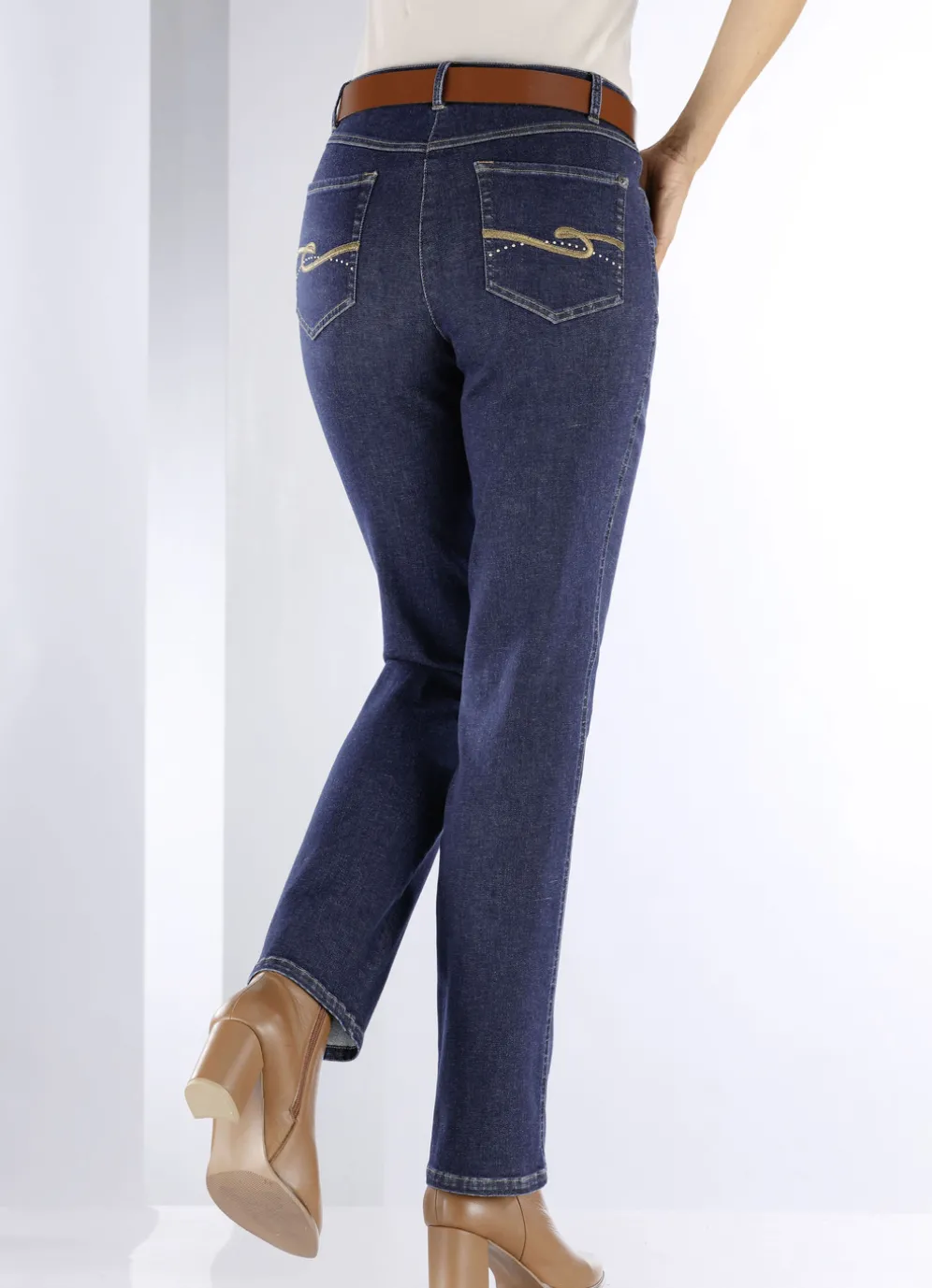 Tragangenehme Jeans in 4-Pocket-Form: elastischer Formbund, Gürtelschlaufen, Knopf- und Reißverschluss, Jeanssattel, figurgünstige Teilungsnähte im Vorderteil sowie kontrastfarbene Stickerei, verziert mit Steinchen an den aufgesetzten Gesäßtaschen. Innenbeinlänge ca. 78 cm, Fußweite ab 38 cm.