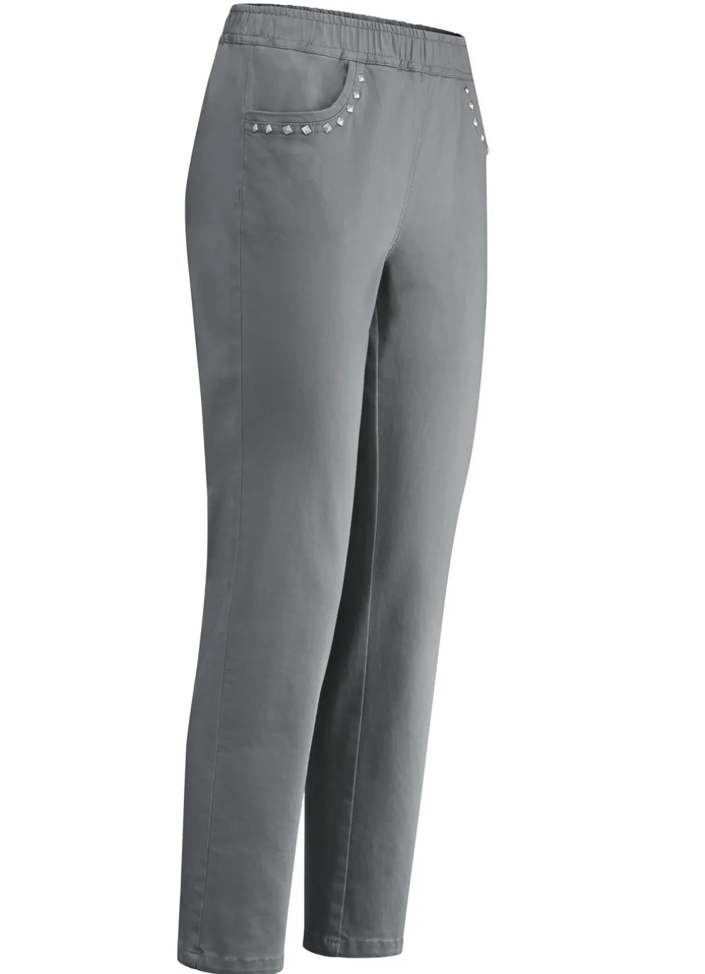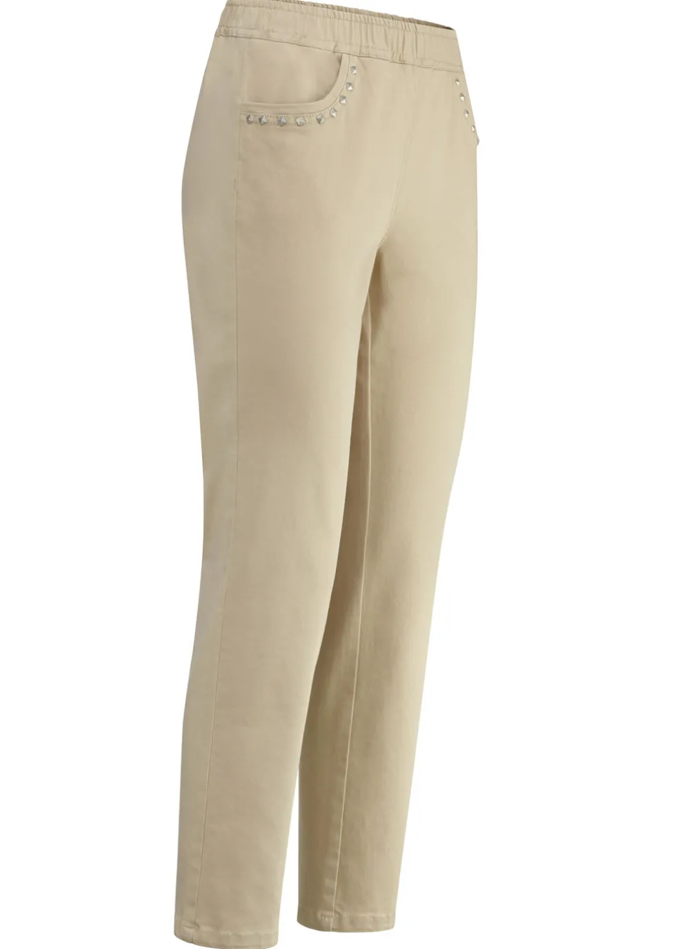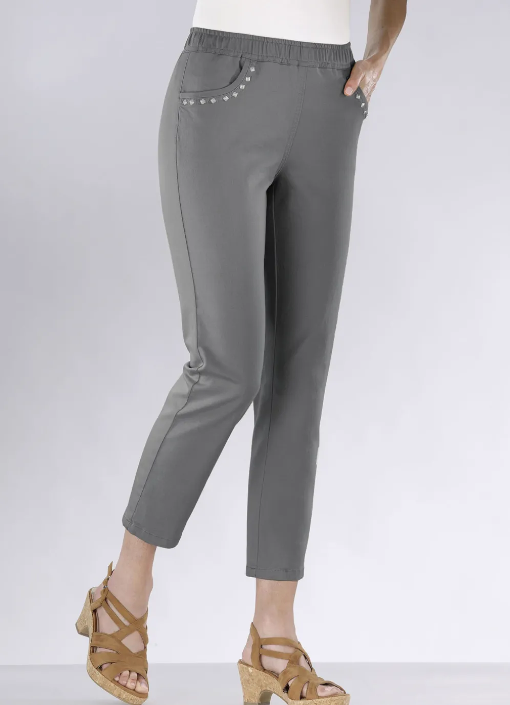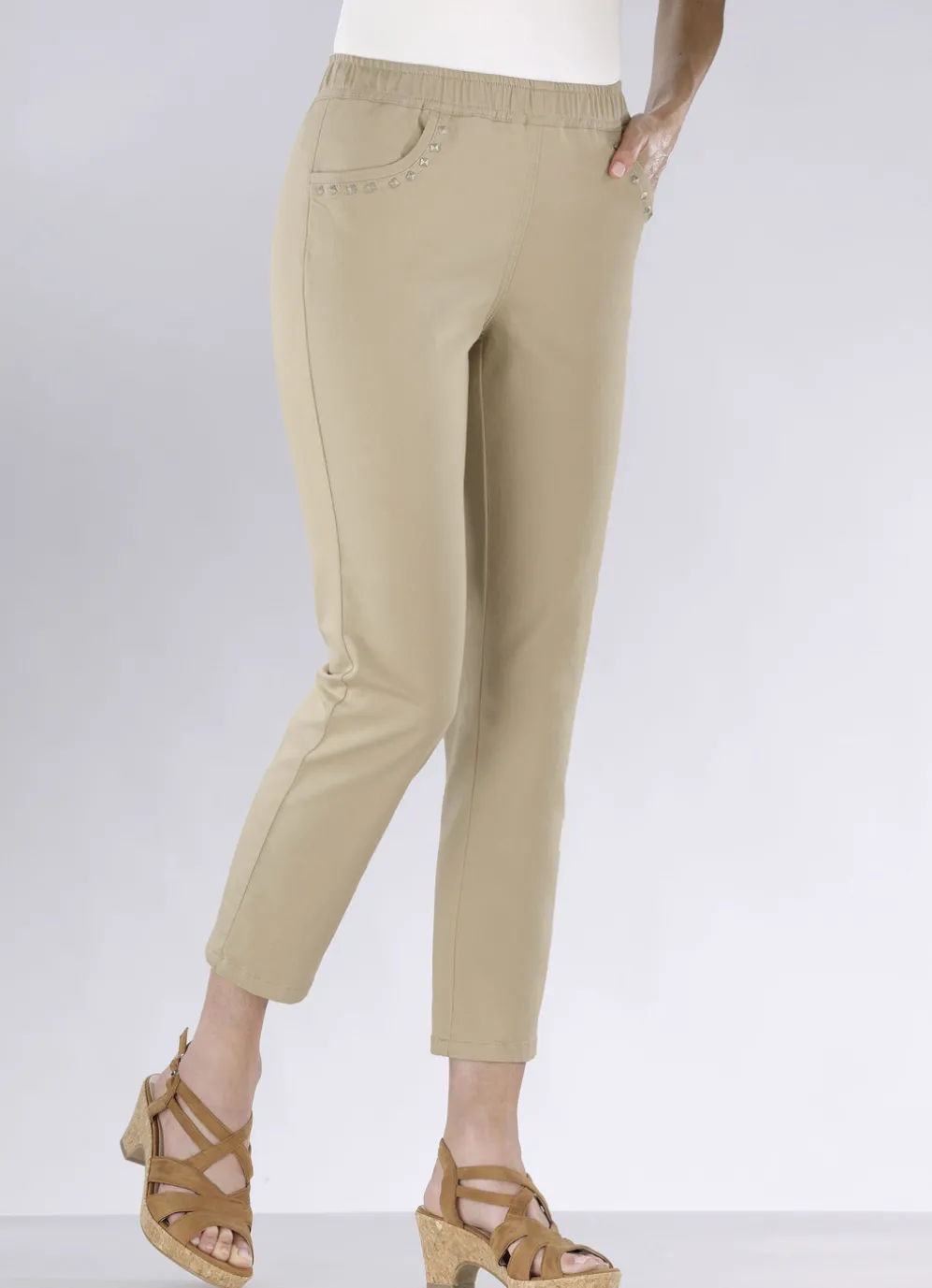 Ansprechende und superbequeme Jeans in 7/8-Länge: kompfortable Schlupfform mit Dehnbund rundum sowie Seitentaschen mit hübscher Nietenzier. Innenbeinlänge ca. 66 cm, Fußweite ab 36 cm.