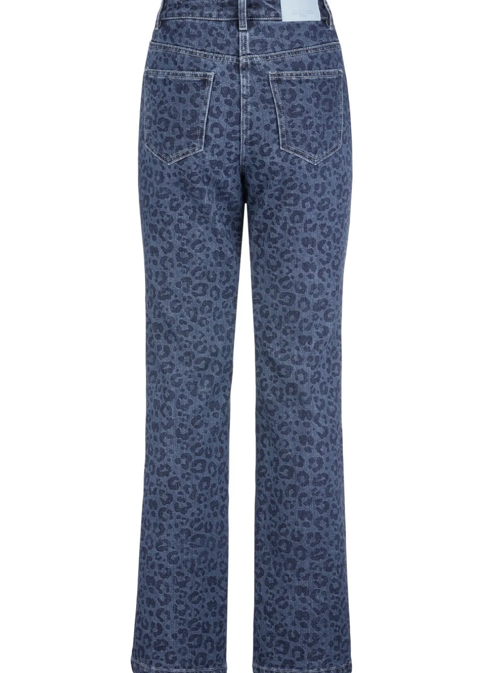 Trendig gestylte Jeans in modischer Weite und aktueller Leo-Dessinierung: 5-Pocket-Form, elastischer Bund, Gürtelschlaufen, Knopf- und Reißverschluss, Jeanssattel sowie dezente Used-Effekte allover. Innenbeinlänge ca. 78 cm, Fußweite ab 52 cm.