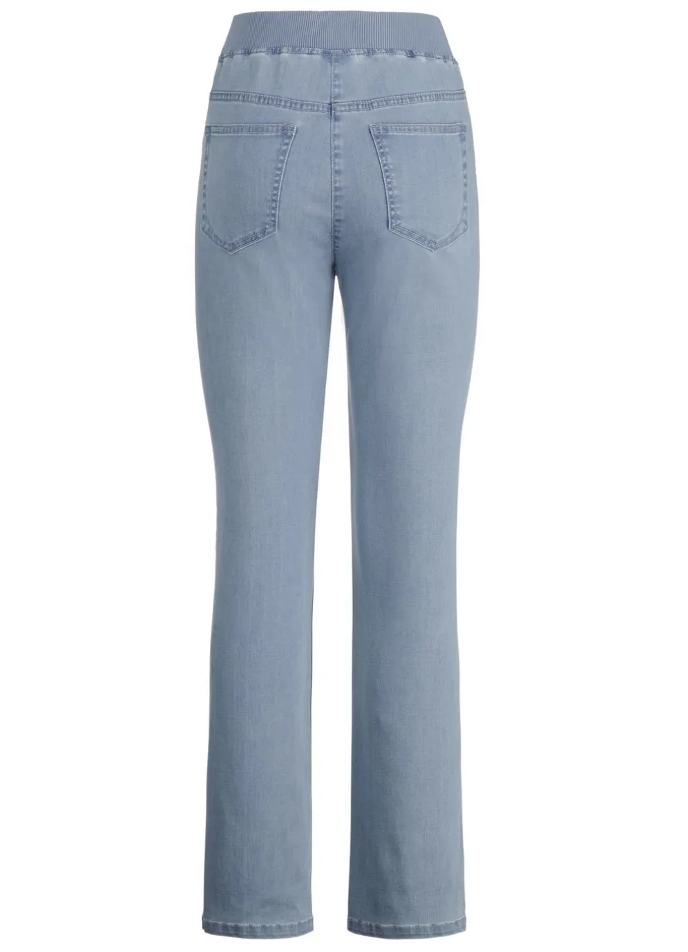 Trendig und superbequem zugleich: Jeans in Schlupfform, formbeständiger Rundum-Dehnbund in Jersey-Qualität, angedeutete Reißverschluss-Zierblende, Seitentaschen, aufgesetzte Gesäßtaschen sowie Jeanssattel. Innenbeinlänge ca. 77 cm, Fußweite ab 35 cm