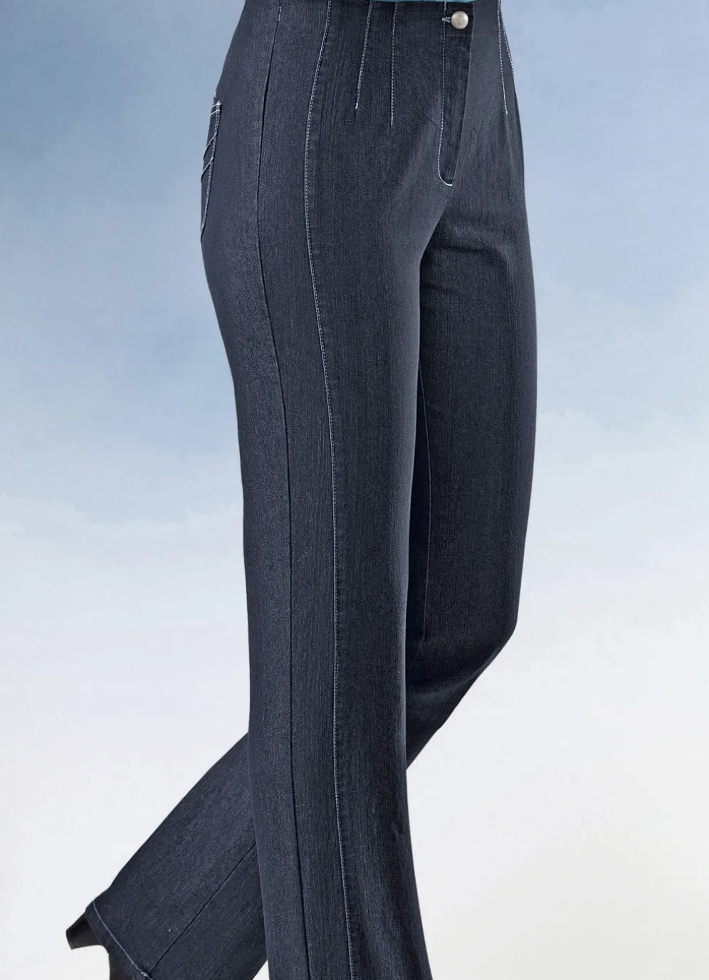 Hochelastische, tragangenehme schwarze Jeans: angeschnittener Bund, glatt anliegend dank der innen liegenden, komfortablen Gummibundeinlage mit bis zu 6 cm Dehnreserve, vorderer Knopf- und Reißverschluss, figurformende Abnäher unterhalb des Bundes rundum, figurgünstige, kontrastfarben abgesteppte Teilungsnähte vorne sowie aufgesetzte Gesäßtaschen mit abgesteppten Biesen. Innenbeinlänge ca. 82 cm, Fußweite ab 42 cm.