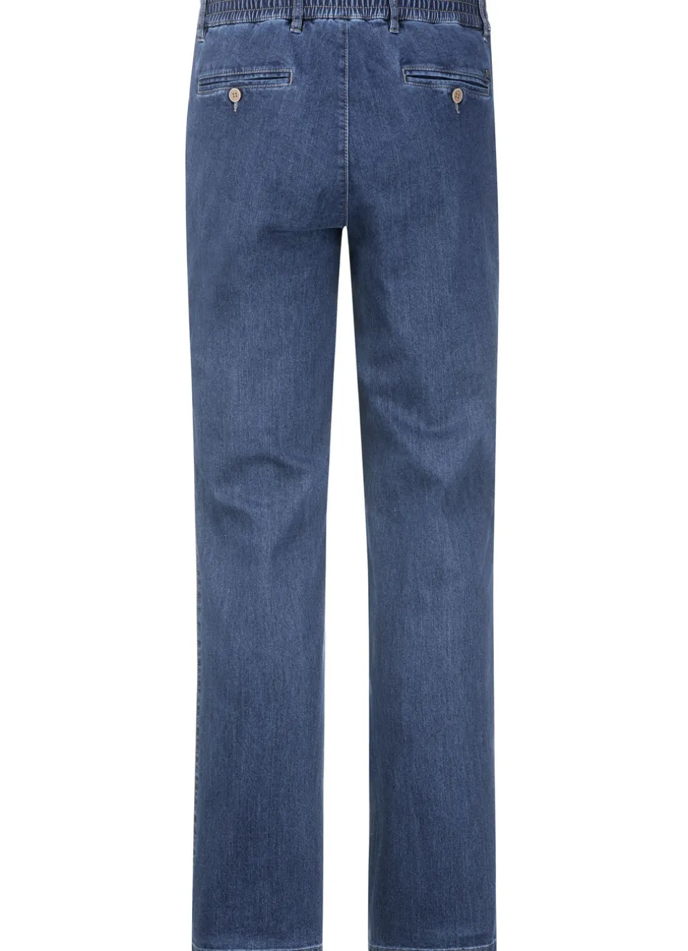 Jeans mit Seitentaschen, Gummibund, Kleingeldtasche sowie Gesäßpaspeltaschen mit Knopfverschluss.