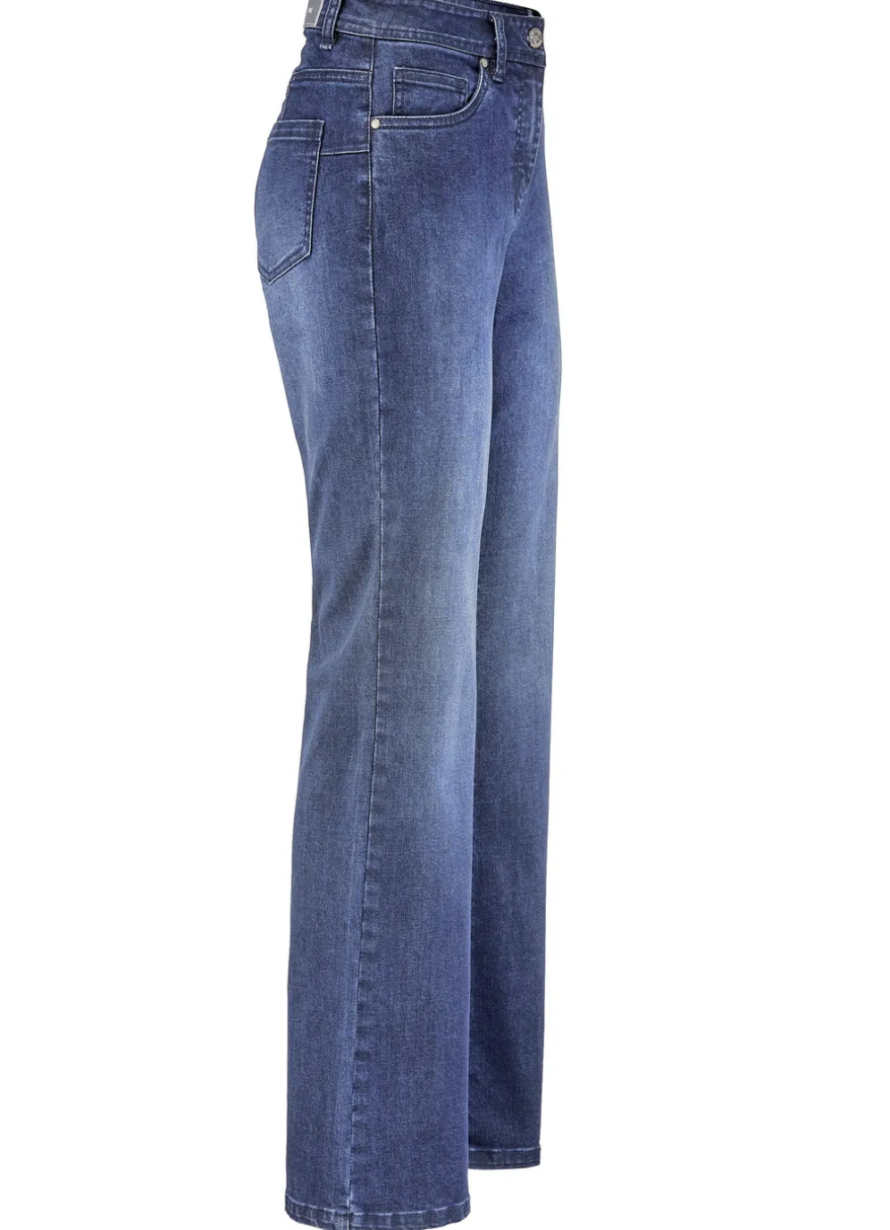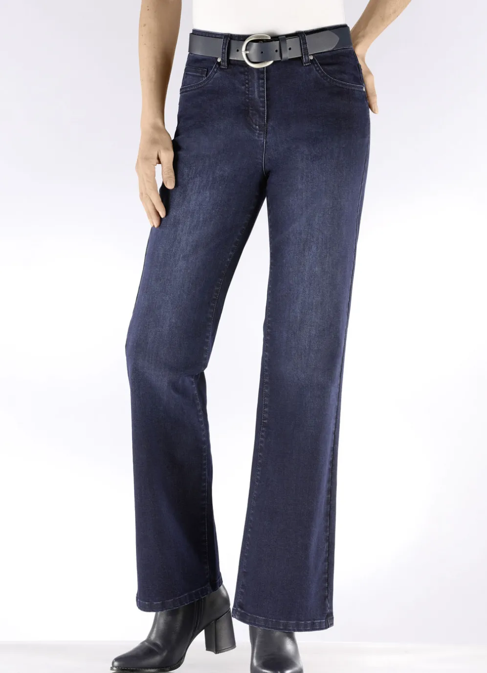 Komfortable 5-Pocket-Jeans mit modischer Beinweite und Push-up-Effekt: elastischer Formbund, Gürtelschlaufen, Knopf- und Reißverschluss, dezente Used-Effekte vorne und hinten, aufgesetzte Gesäßtaschen sowie Jeanssattel. Innenbeinlänge ca. 78 cm, Fußweite ab 48 cm.