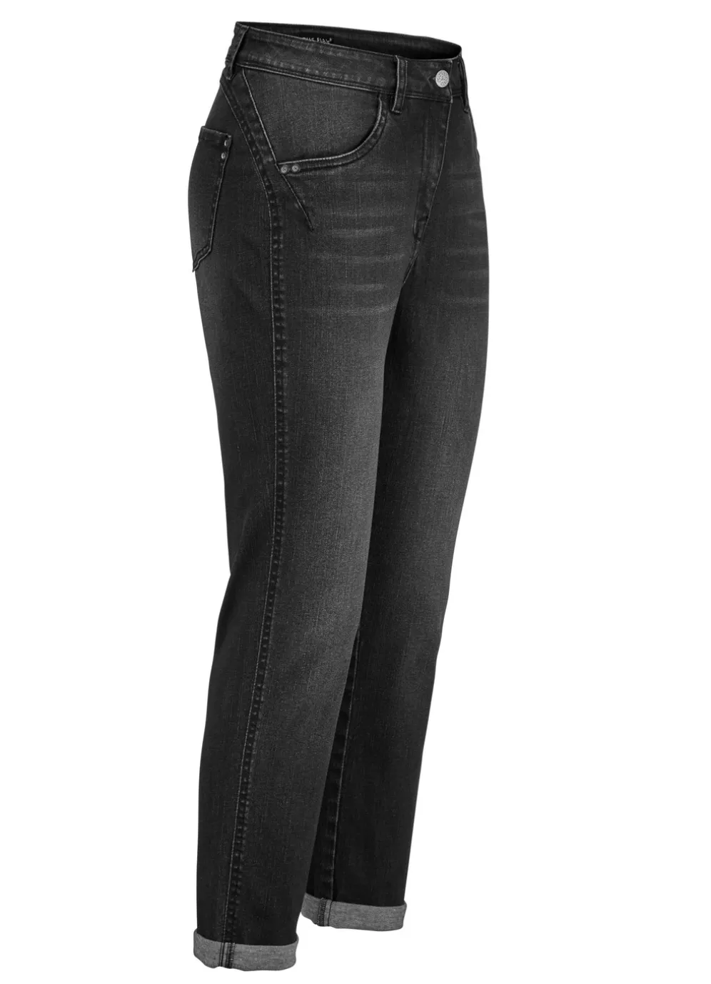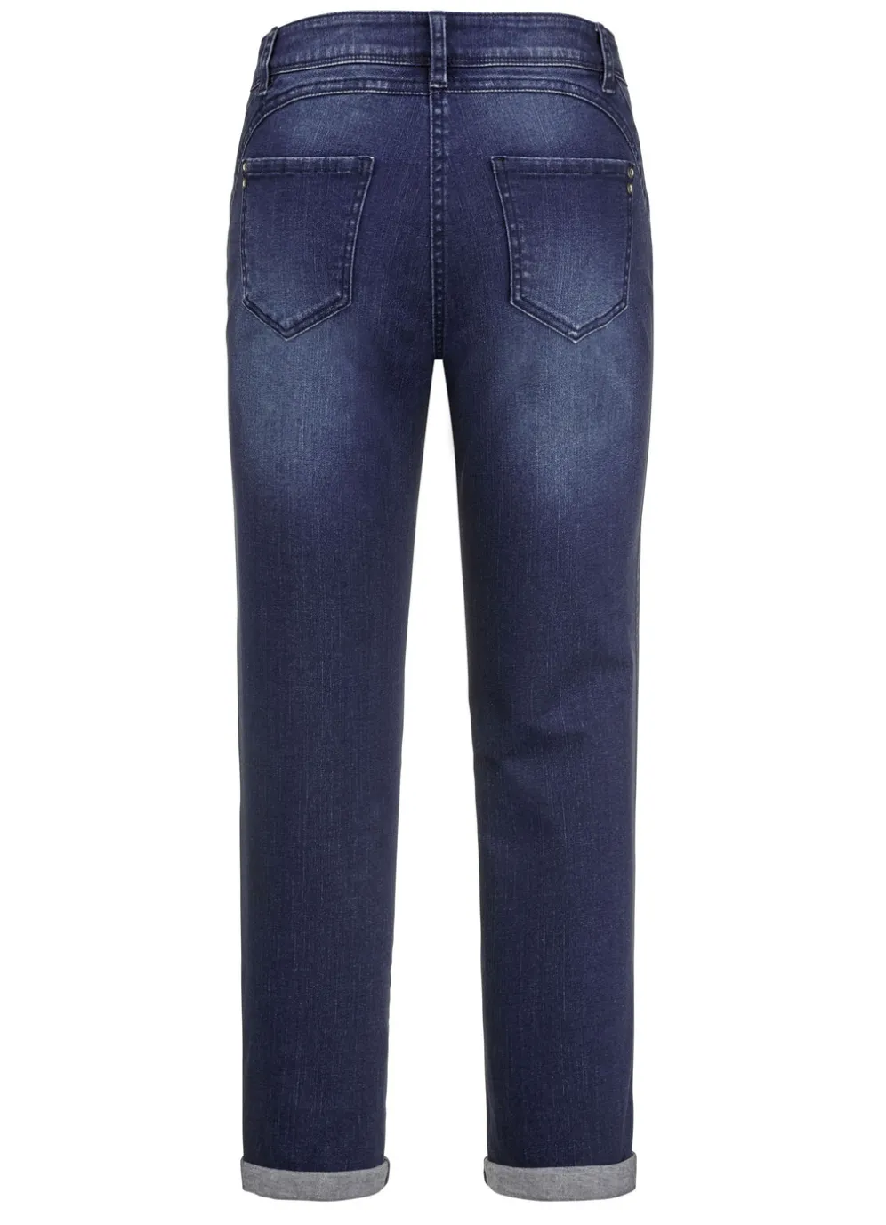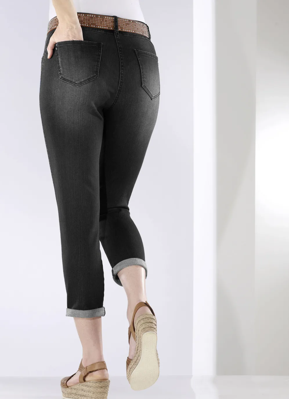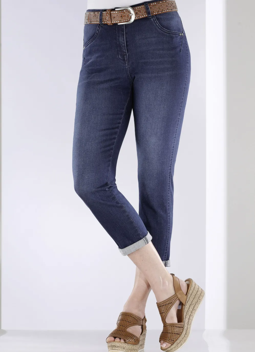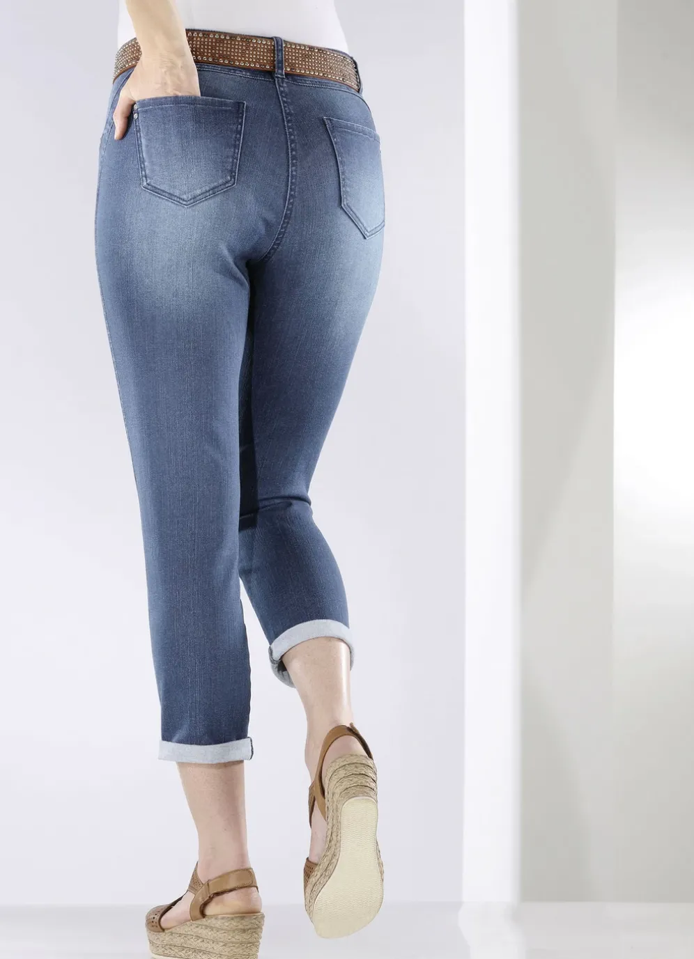 Für eine Traumfigur sorgt diese flotte Jeans mit Push-Up Effekt: 4-Pocket-Form, elastischer Formbund, Gürtelschlaufen, Knopf- und Reißverschluss, krempelbar. Ohne Gürtel. Innenbeinlänge ca. 71 cm, Fußweite ab 33 cm