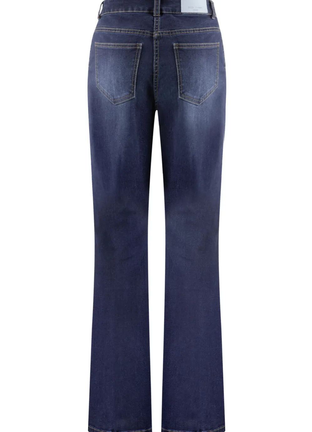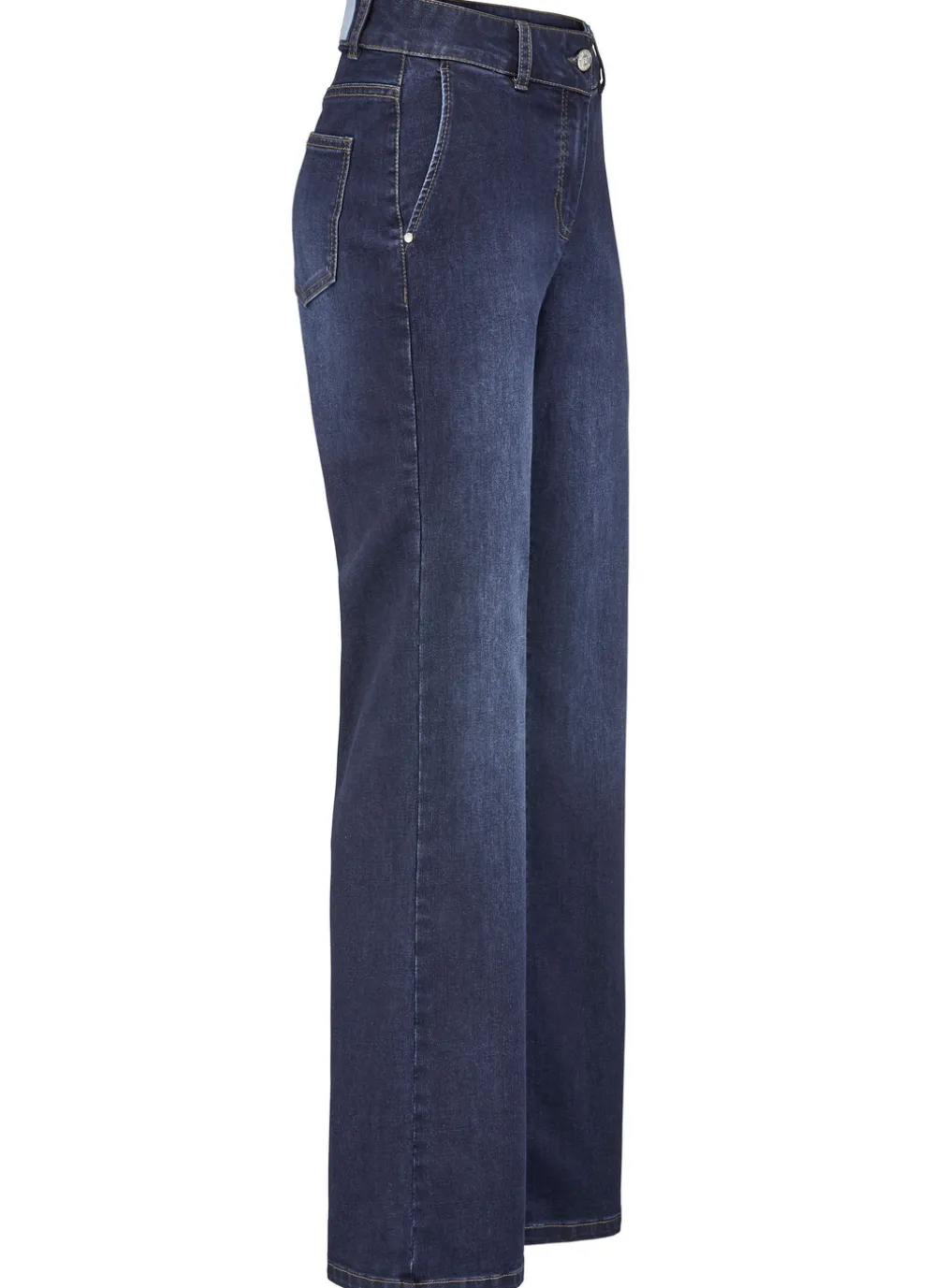 Angesagte, dunkelblaue Jeans mit modisch weiterem Beinverlauf sowie trendiger Waschung: elastischer Formbund, Gürtelschlaufen, Knopf- und Reißverschluß, Seitentaschen, aufgesetzte Gesäßtaschen sowie Jeanssattel. Innenbeinlänge ca. 78 cm, Fußweite ab 52 cm.