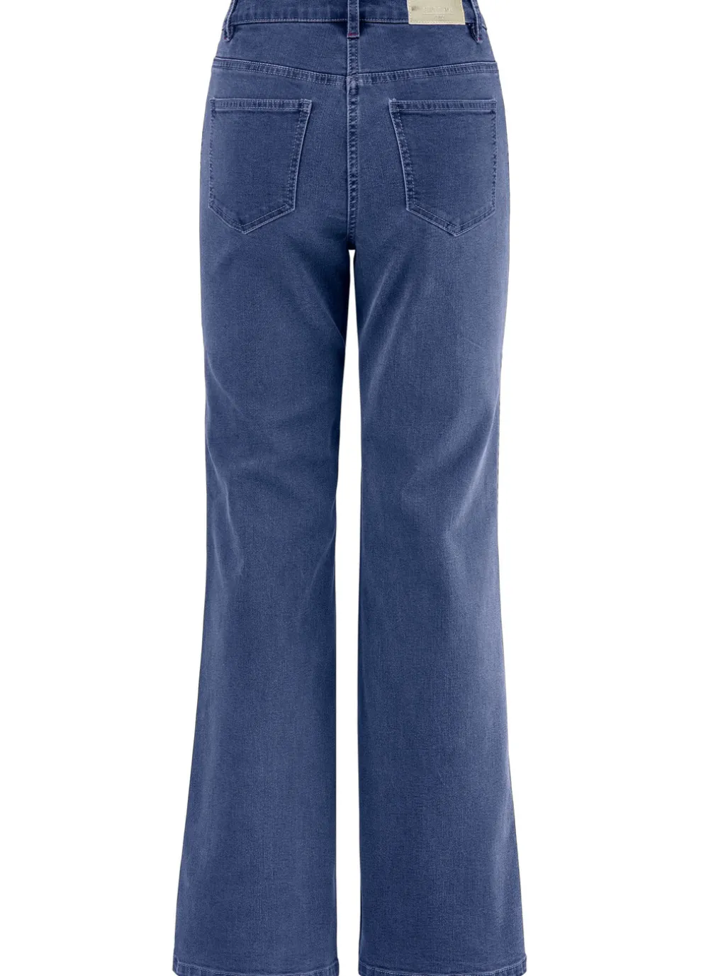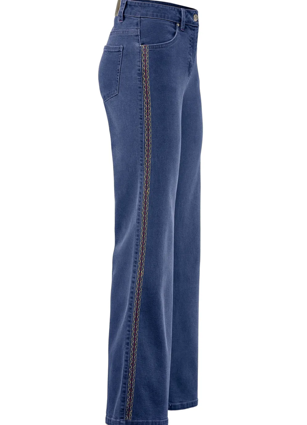 Attraktive Jeans mit trendigen Ziersteppungen im Ethno-Style entlang des weiten Beinverlaufes: 4-Pocket-Form, elastischer Formbund, Gürtelschlaufen, Knopf- und Reißverschluss sowie Jeanssattel. Innenbeinlänge ca. 78 cm, Fußweite ab 54 cm.