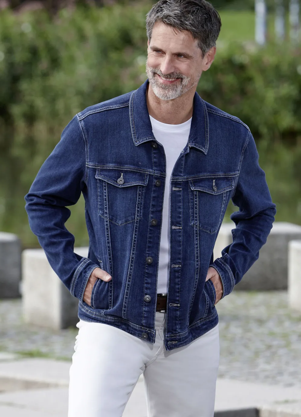 Jeansblaue „Paddock’s“-Jeansjacke mit 6-Knopf-Verschluss, Seitentaschen, zwei Brustpattentaschen mit Knopfverschluss, Ärmelabschlüsse mit Knopf, verstellbarem Riegel mit Knopf am Bund sowie zwei Innentaschen.