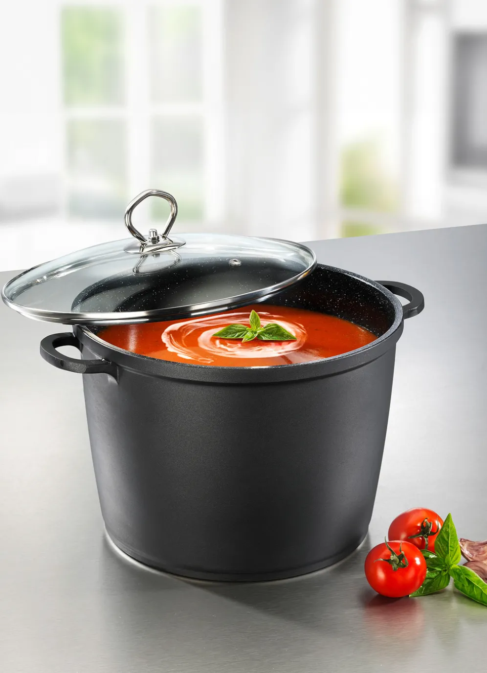 „KING” Alugusstopf mit keramischer Antihaftbeschichtung. Besonders kratzfest und langlebig. Kein Anhaften und einfach zu reinigen. Für die fettarme oder fettfreie Zubereitung von Speisen. Backofengeeignet bis 180 °C; mit Deckel bis 150 °C. Topf ø 24 cm, H18 cm, 7 Liter mit Glasdeckel mit Dampfablassventil. Für alle Herdarten geeignet, auch Induktion