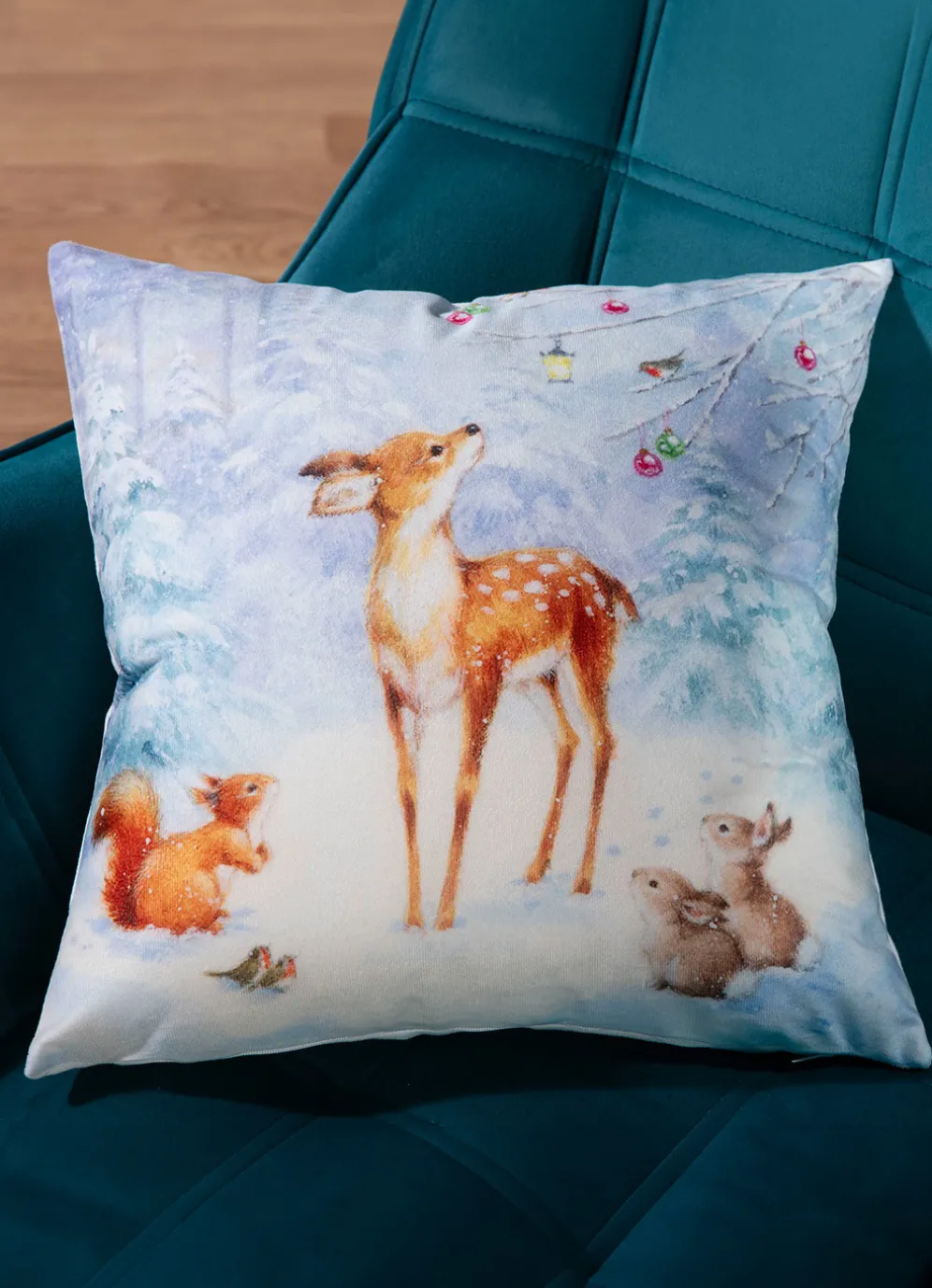 Die niedlichen Waldbewohner auf diesem hübschen Kissenbezug in Samtoptik verbreiten wundervolle Stimmung zur Winterzeit. Mit Reißverschluss sowie Uni-Rückseite gearbeitet. Qualität: 100% Polyester. Maße: 40×40 cm