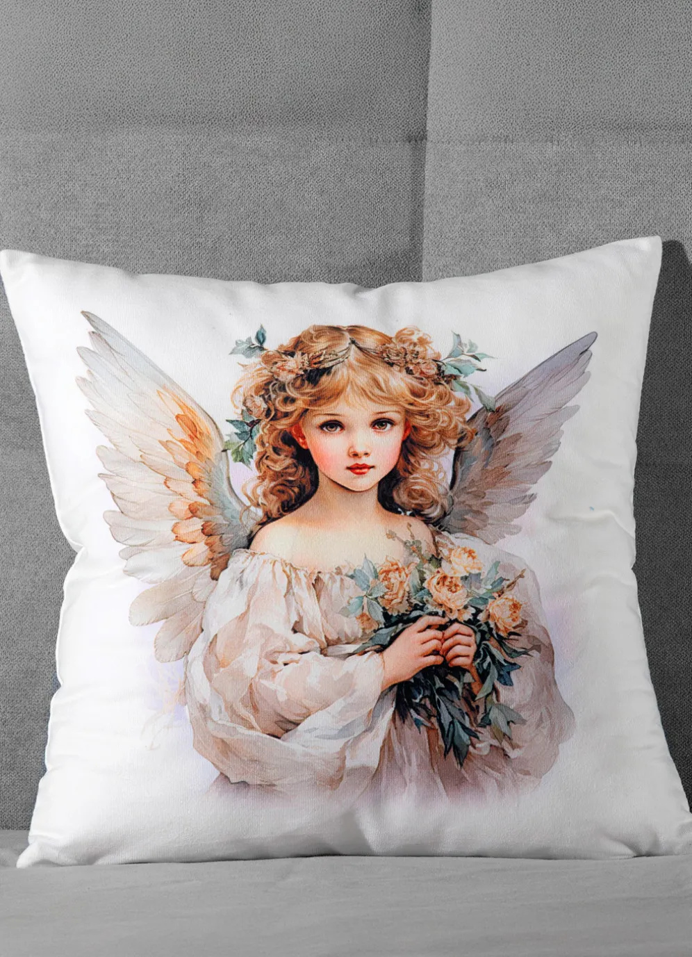 Kissenbezug in weicher Samtoptik in der Ausführung Engelskind mit Blumenstrauß und in Bunt.