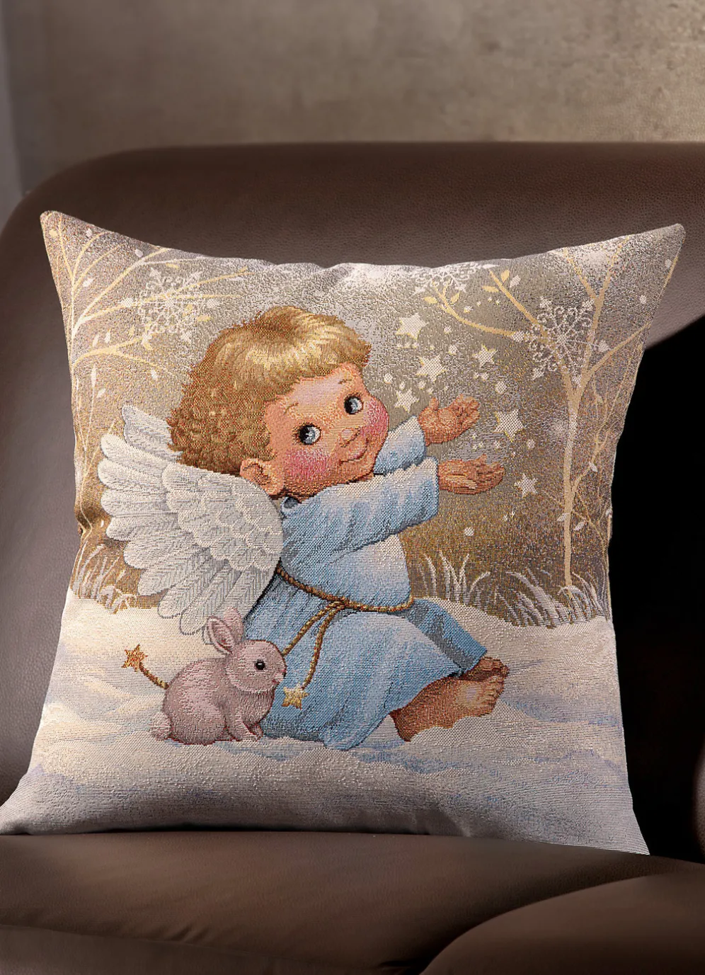 Ein süßer, pausbäckiger Engel und ein kleines Häschen grüßen Sie von diesem fein gearbeiteten Kissenbezug. Mit praktischem Reißverschluss.