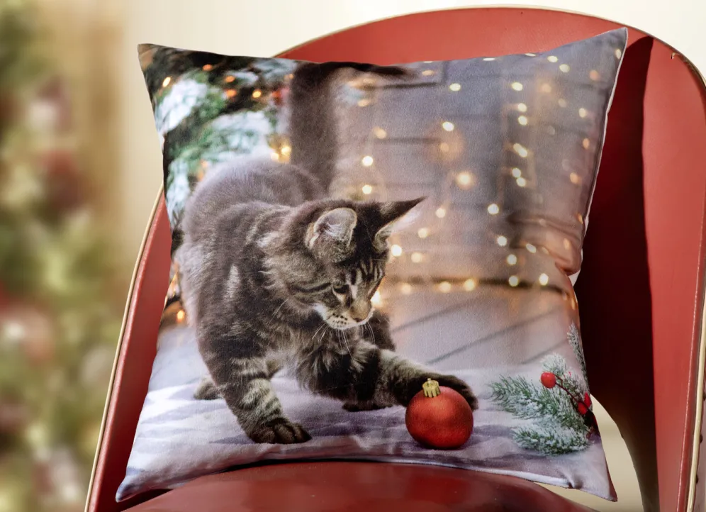 Dieser entzückende Katzen-Kissenbezug verschönert Ihr Zuhause in der Weihnachts- und Winterzeit. Er ist ein echter Blickfang und lädt mit seinem Motiv einer süßen Katze mit Weihnachtsbaumkugel zum Träumen ein. Mit praktischem Reißverschluss gefertigt. Die Qualität: 100% Polyester. Maße: 40×40 cm.