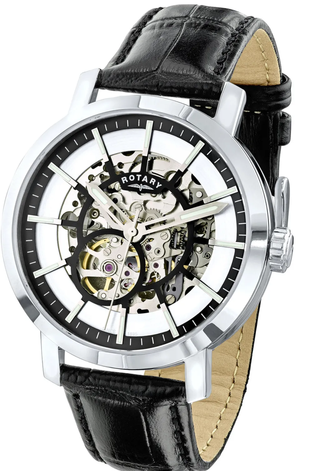 Die Herrenuhr hat ein Edelstahlgehäuse, ein schwarzes Lederband und Saphirglas. Das Werk dieser Automatik-Uhr ist von beiden Seiten sichtbar und auf 21 Steinen gelagert. Die Herrenuhr ist 5 bar wasserdicht und hat einen Gehäusedurchmesser von 42mm.