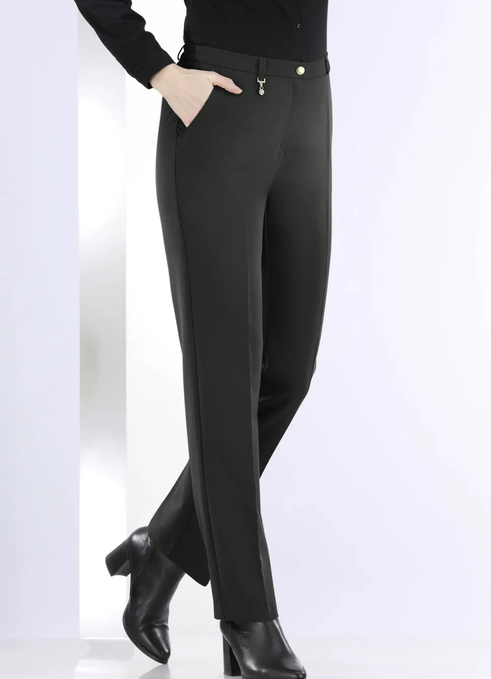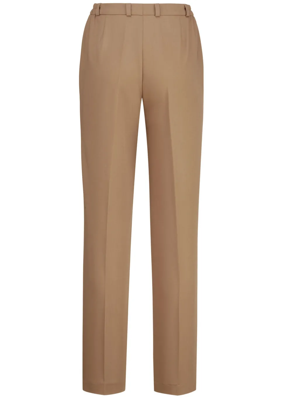 Klassische Hose mit rückwärtigen Dehnbundeinsätzen, aparter Zieranhänger an einer der vorderen Gürtelschlaufen, Haken- und Reißverschluss sowie Seitentaschen, figurformende Abnäher unterhalb des Bundes im Rückteil. Innenbeinlänge ca. 78 cm, Fußweite ab 38 cm.