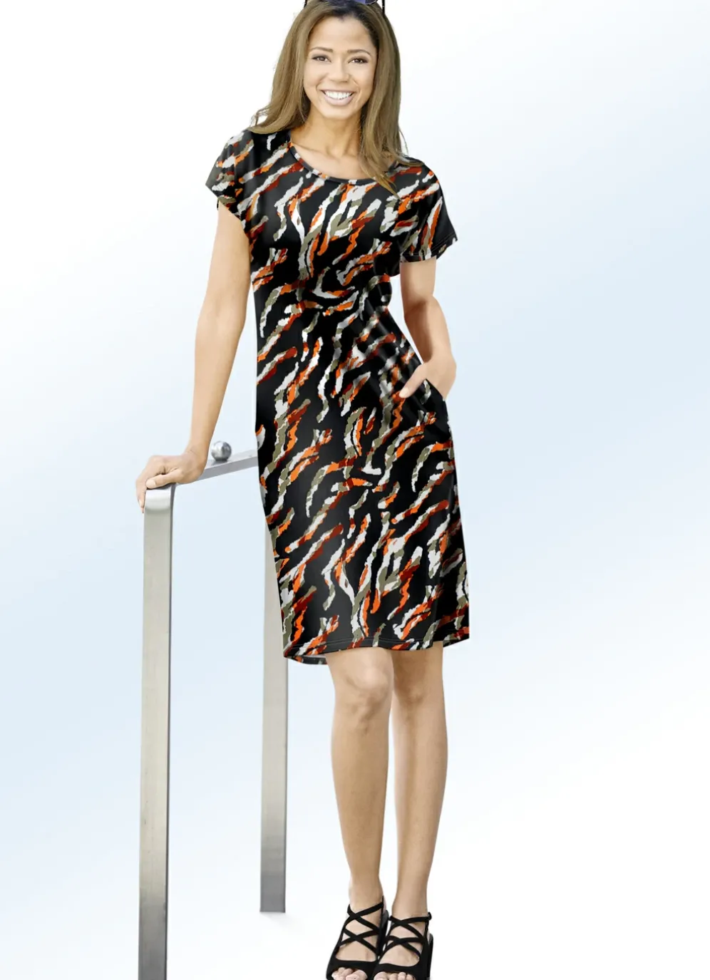 Extravagantes Kleid in Schlupfform, ausdrucksstark dessiniert mit farbbrillantem Inkjet-Druck in Schwarz-Orange-Ecru-Bunt: runder Halsausschnitt, überschnittene Schulterpartie sowie zwei Seitennahttaschen.