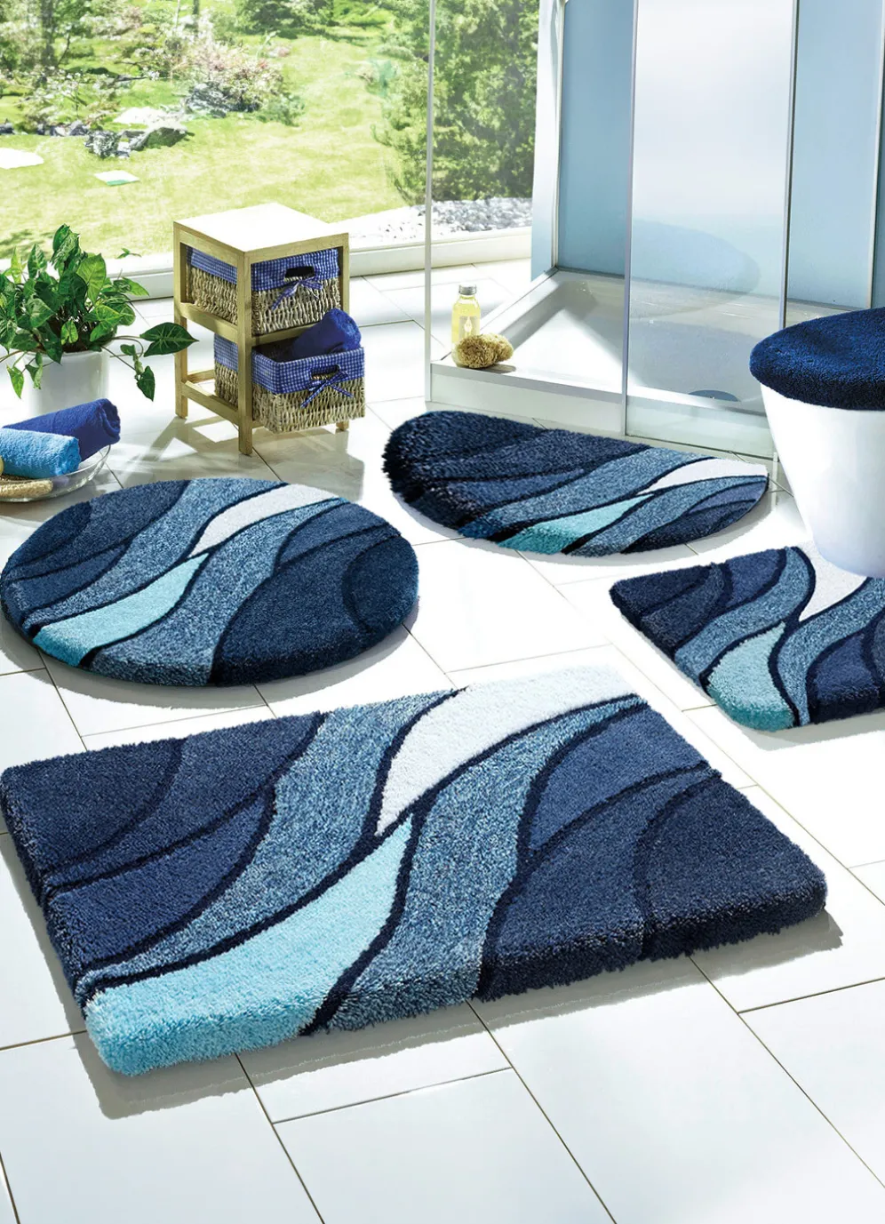 | Size | 100 (Vorleger halbrund, 50/ 80 cm), 101 (Teppich, 50/ 90 cm), 102 (Teppich, 60/100 cm), 103 (Teppich, 70/120 cm), 105 (Teppich rund, ø 90 cm), 108 (Stand-WC-Vorleger, 50/ 55 cm), 109 (Hänge-WC-Vorleger, 50/ 55 cm), 112 (WC-Deckelbezug, 47/ 50 cm) |