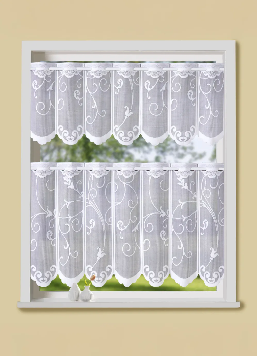 Dieser schöne Kleinfenster-Store mit gebogtem Abschluss und Stangendurchzug besticht durch sein zeitloses Design. Die Qualität: Jacquard aus 100% Polyester.